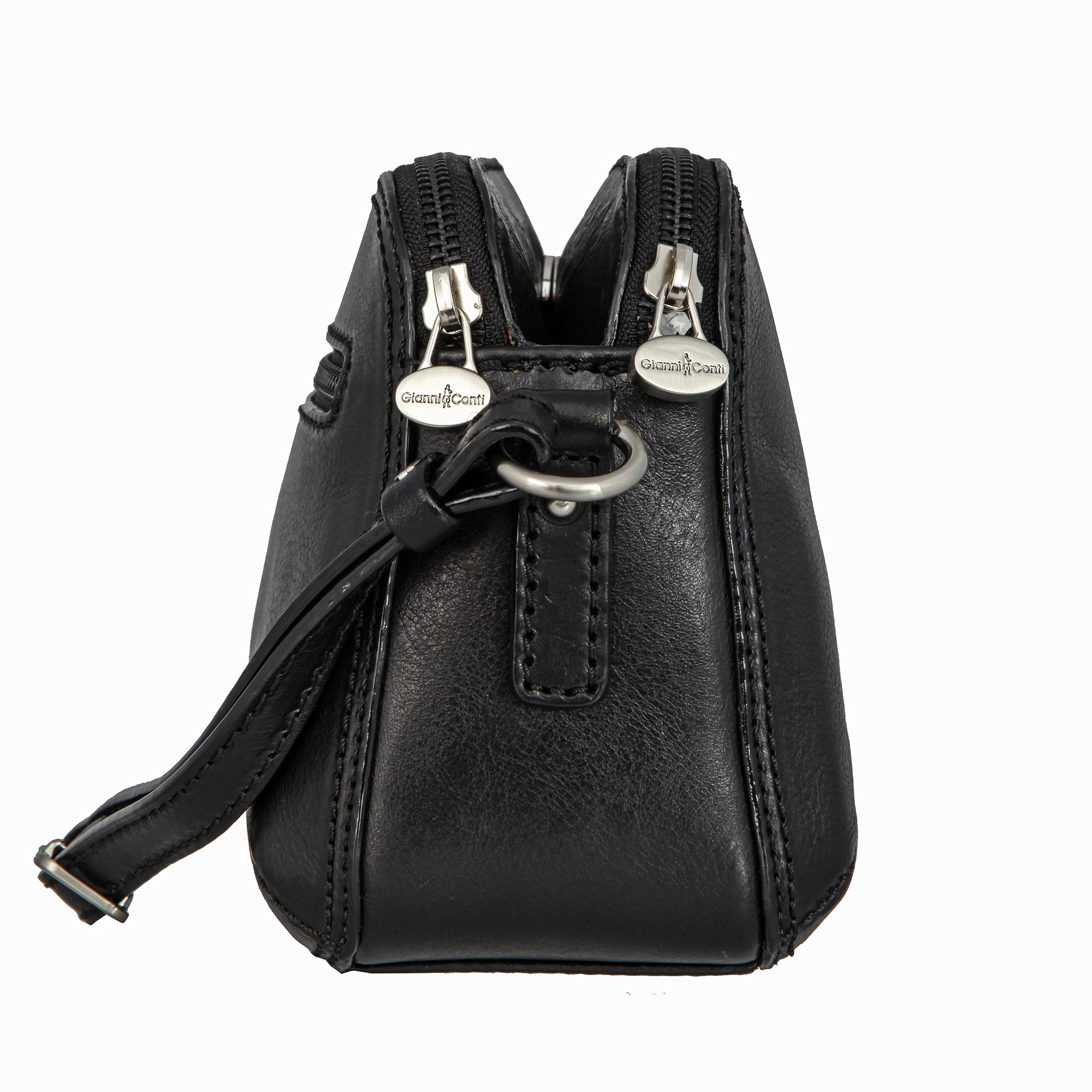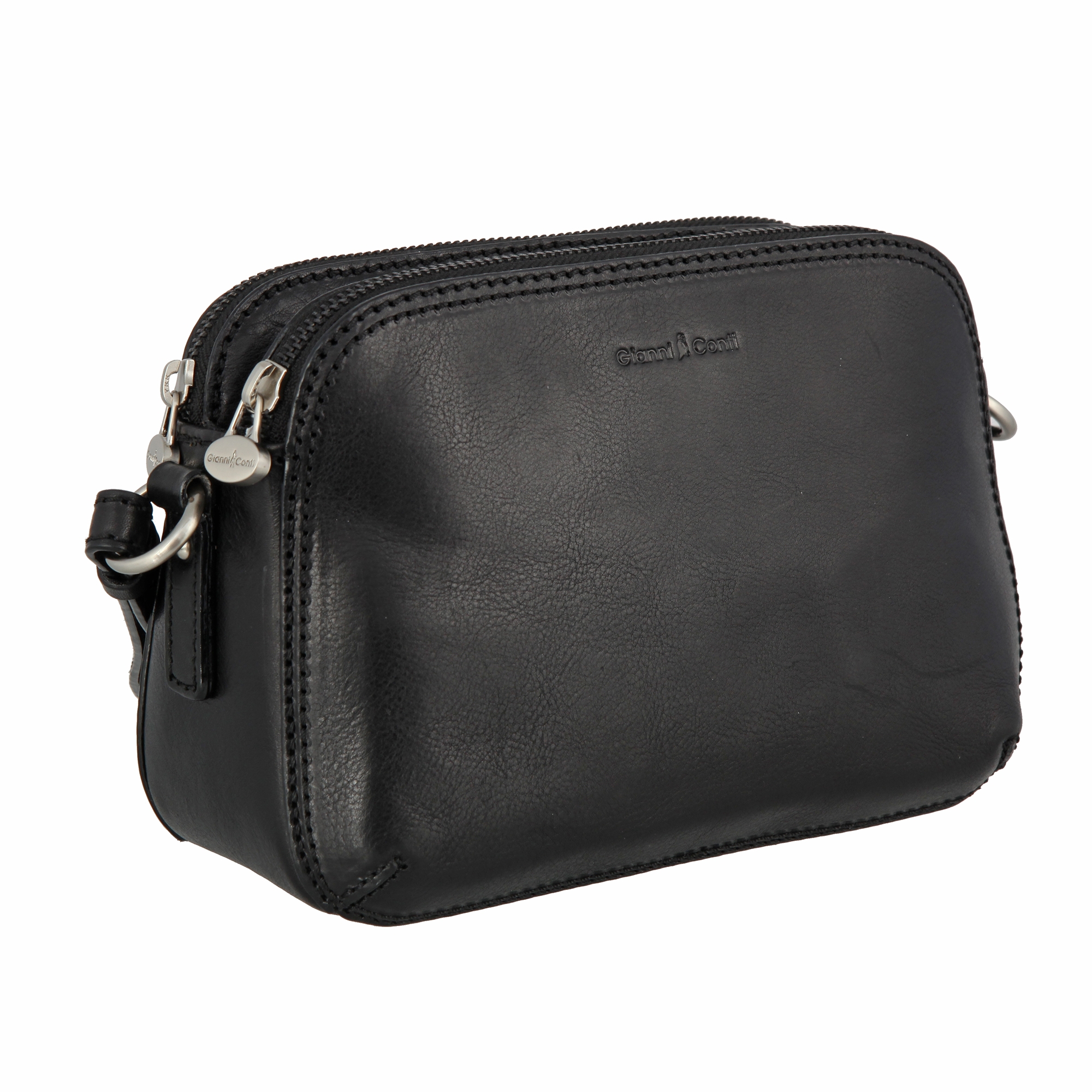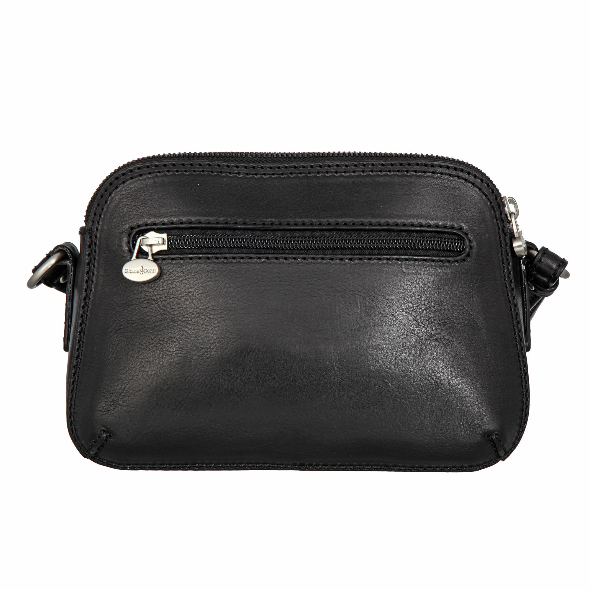 Классическая чёрная женская кожаная сумка от итальянского бренда Gianni Conti. Кожа Vachetta наилучшего качества, растительного дубления. Сумка небольшого размера с двумя независимыми отделениями на молниях, разделенных карманом на магнитной кнопке. Внутри кармашек для мелких предметов и карман для документов на молнии. Снаружи на задней стороне карман быстрого доступа на молнии. Оснащена регулируемым плечевым ремнём, благодаря чему сумку можно носить как на плече, так и через плечо. Цвет фурнитуры - серебро. Размеры: 15 х 22 х 9 см.