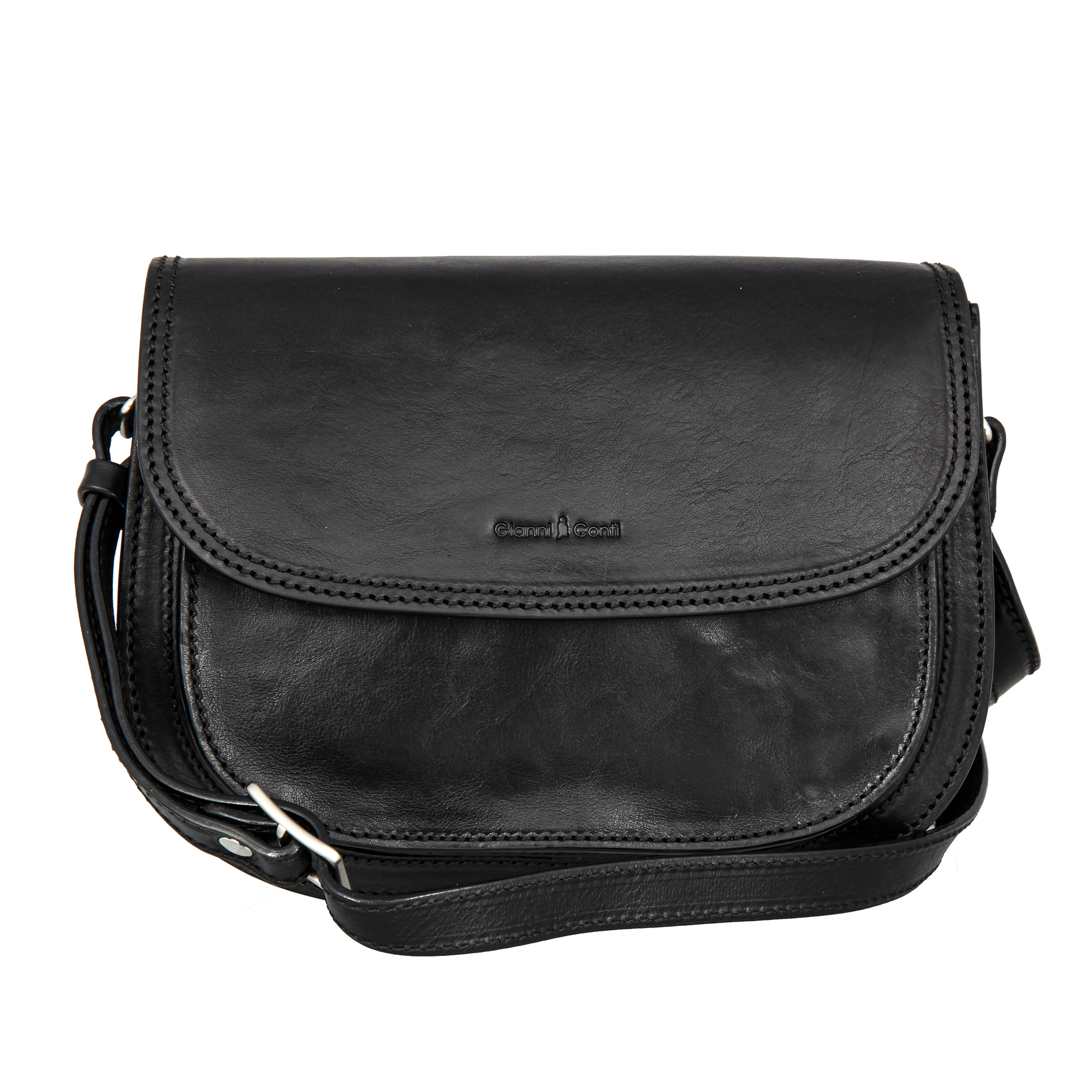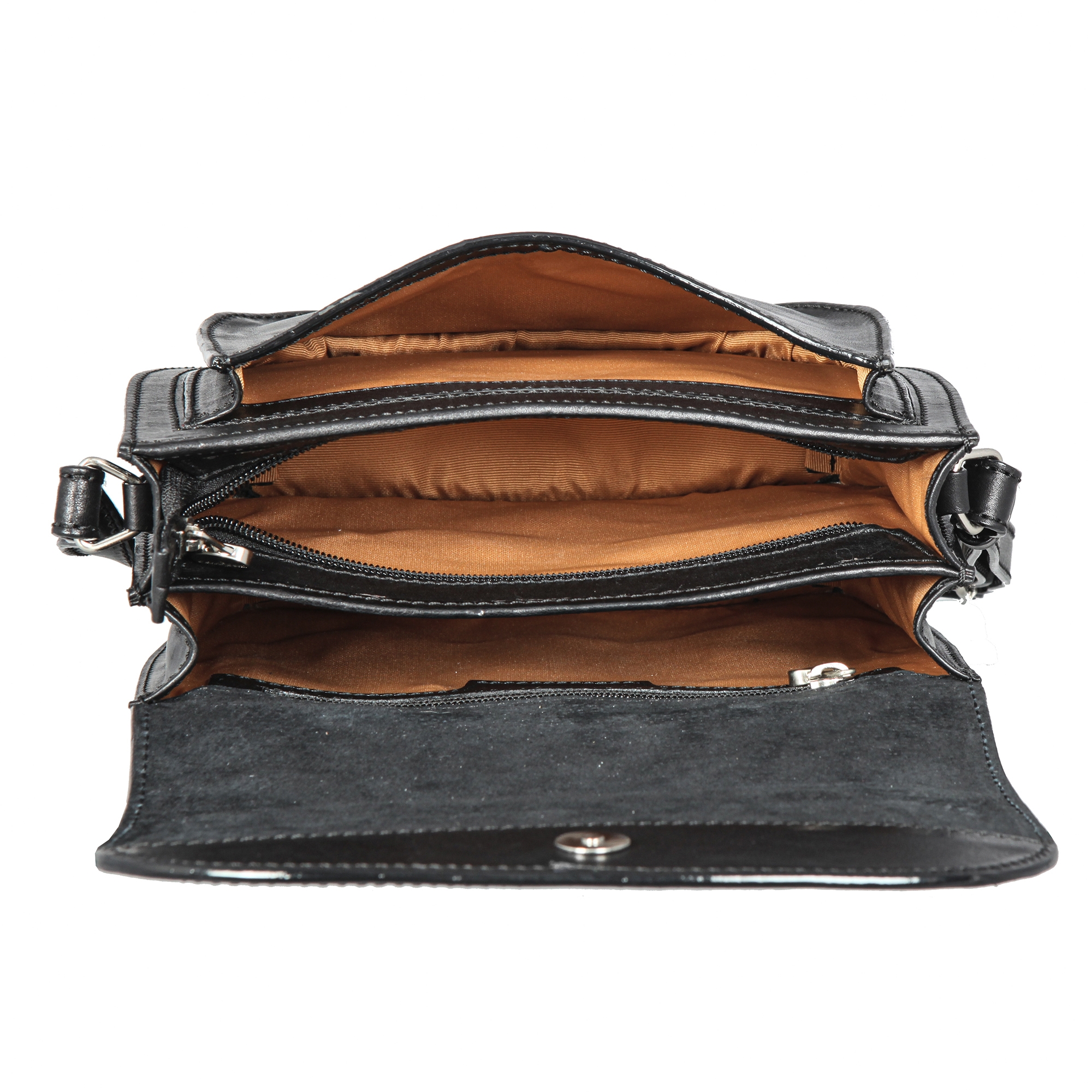Женская сумка через плечо из натуральной кожи чёрного цвета. Внутри два основных отделения, одно из них на молнии, кармашек для телефона и карман для документов на молнии. На передней стенке накладной карман для мелких предметов, на задней стенке карман на молнии. Оснащена регулируемым плечевым ремнём.