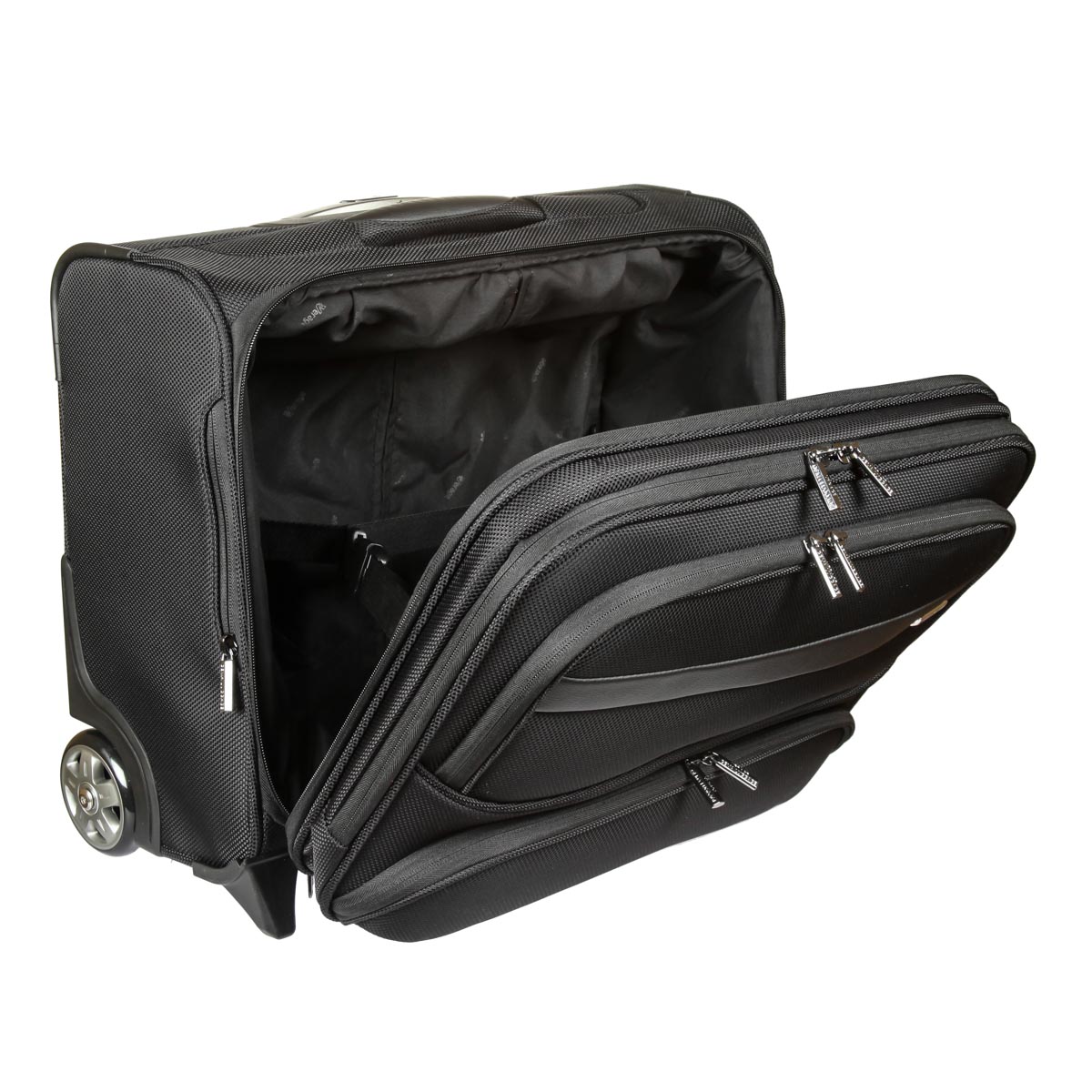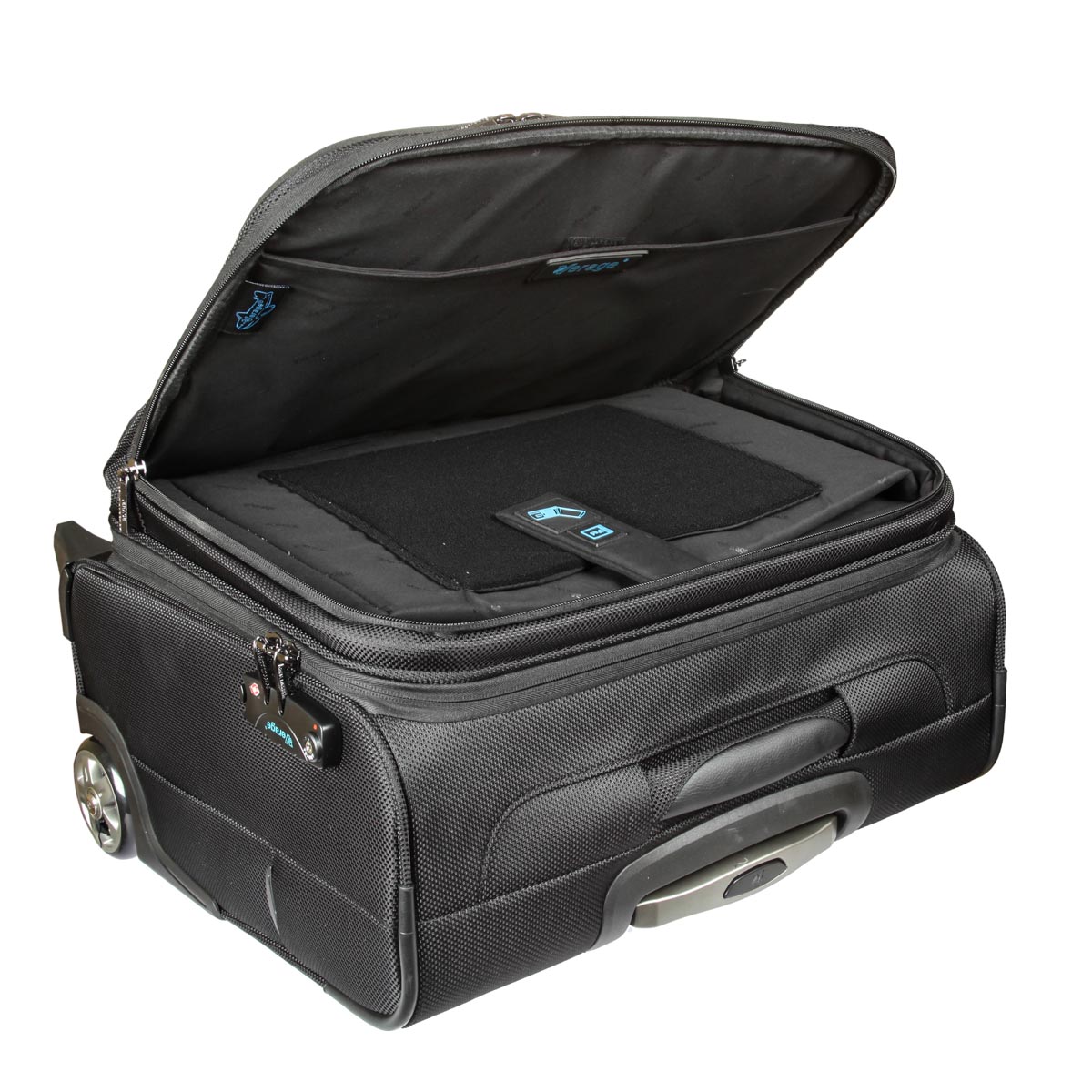 Внутри главного отделения расположены крепление для одежды, карман на липучке и матерчатый разделитель на молнии. Закрывается по периметру на двухстороннюю молнию. Второе отделение также закрывается на молнию по периметру и имеет карман для ноутбука, карман для планшета и карман для документов, все три на липучках. С внешней стороны на передней стенке расположен небольшой кармашек на молнии у основания кейса и мультифункциональный карман на молнии по середине, где расположены карман на молнии, два сетчатых кармашка для мелких предметов, карман для мобильного телефона, три держателя для авторучек, карабин и два кармашка для мелких предметов. На боковой стенке расположен дополнительный вход в главное отделение в виде кармана на молнии. Оснащён мягкой ручкой для удобства переноса, двумя колёсиками с каучуковым покрытием и дополнительным кодовым замком с функцией TSA. Максимальная высота выдвижной ручки 69 см, объём 40 л, вес 4,2 кграмм.
