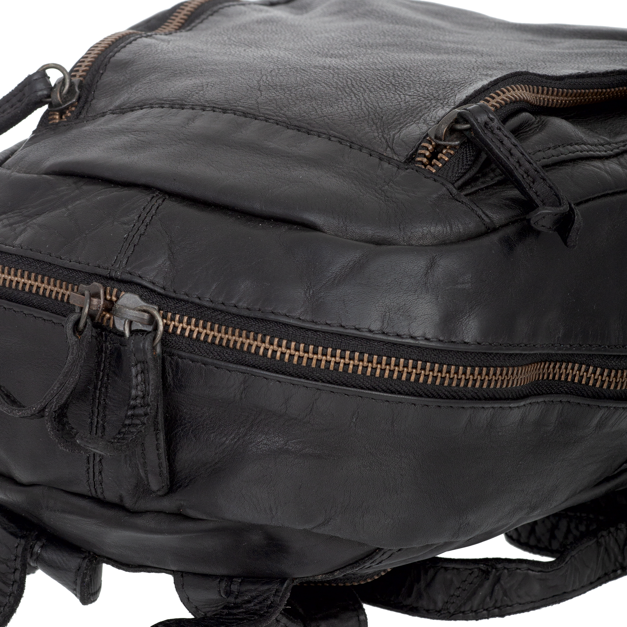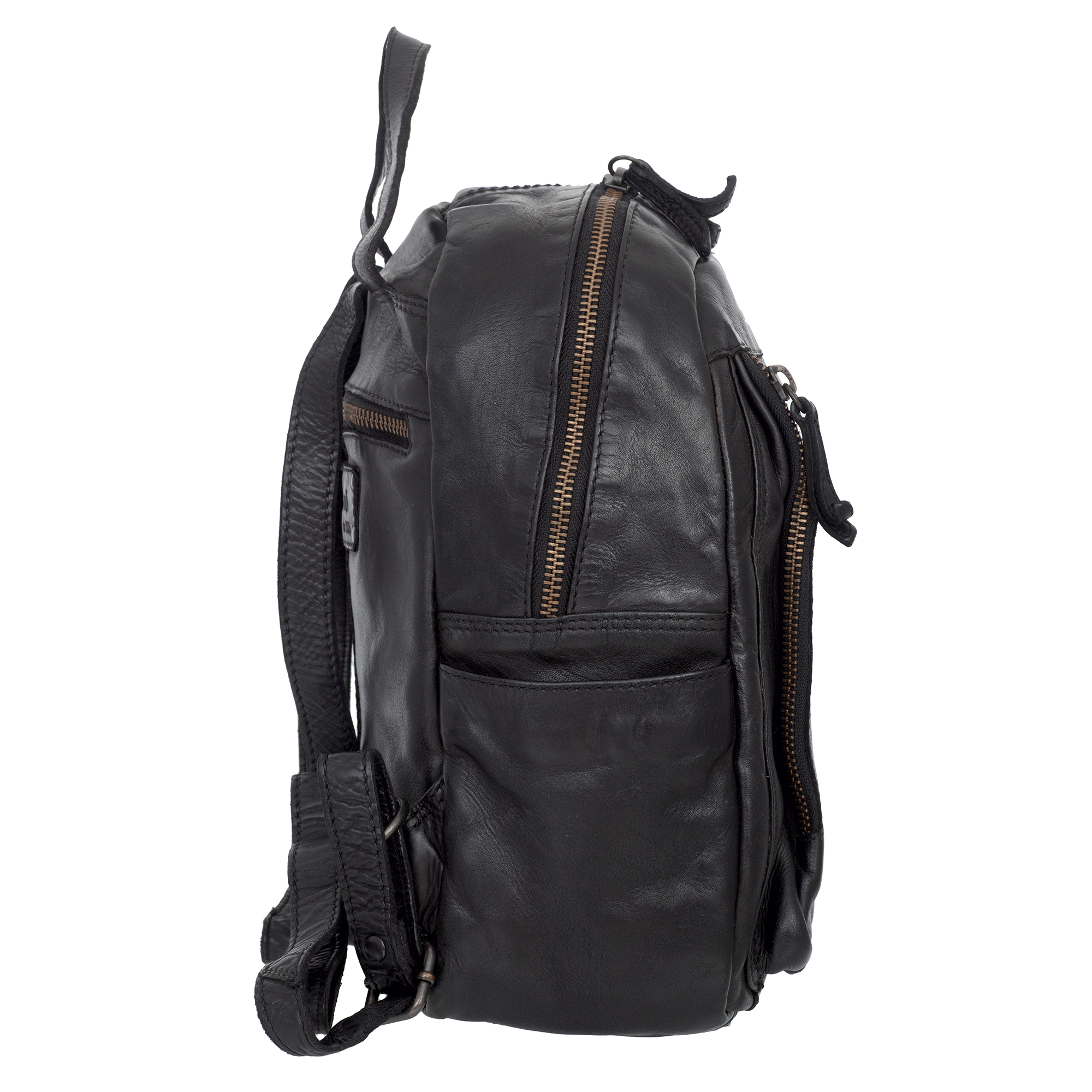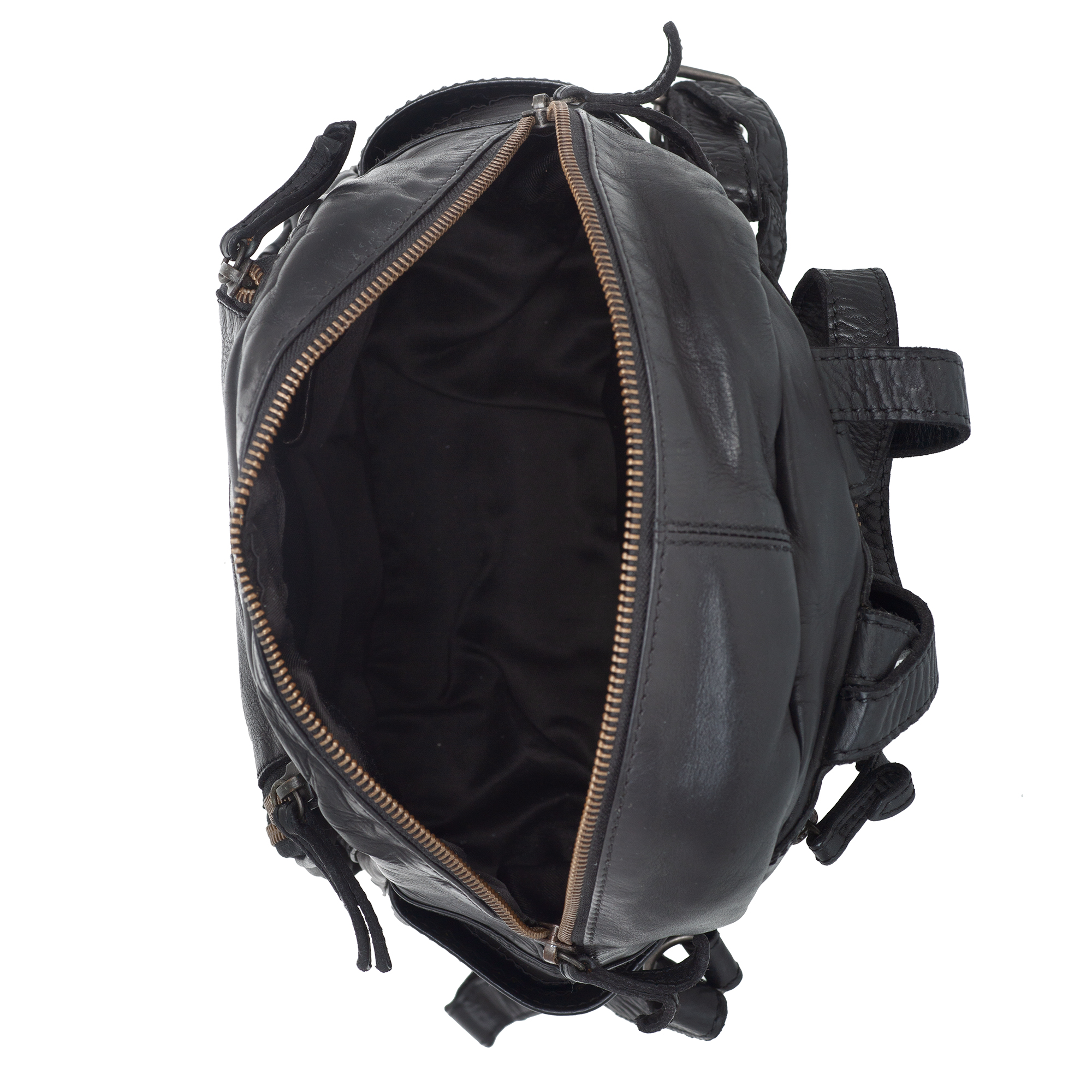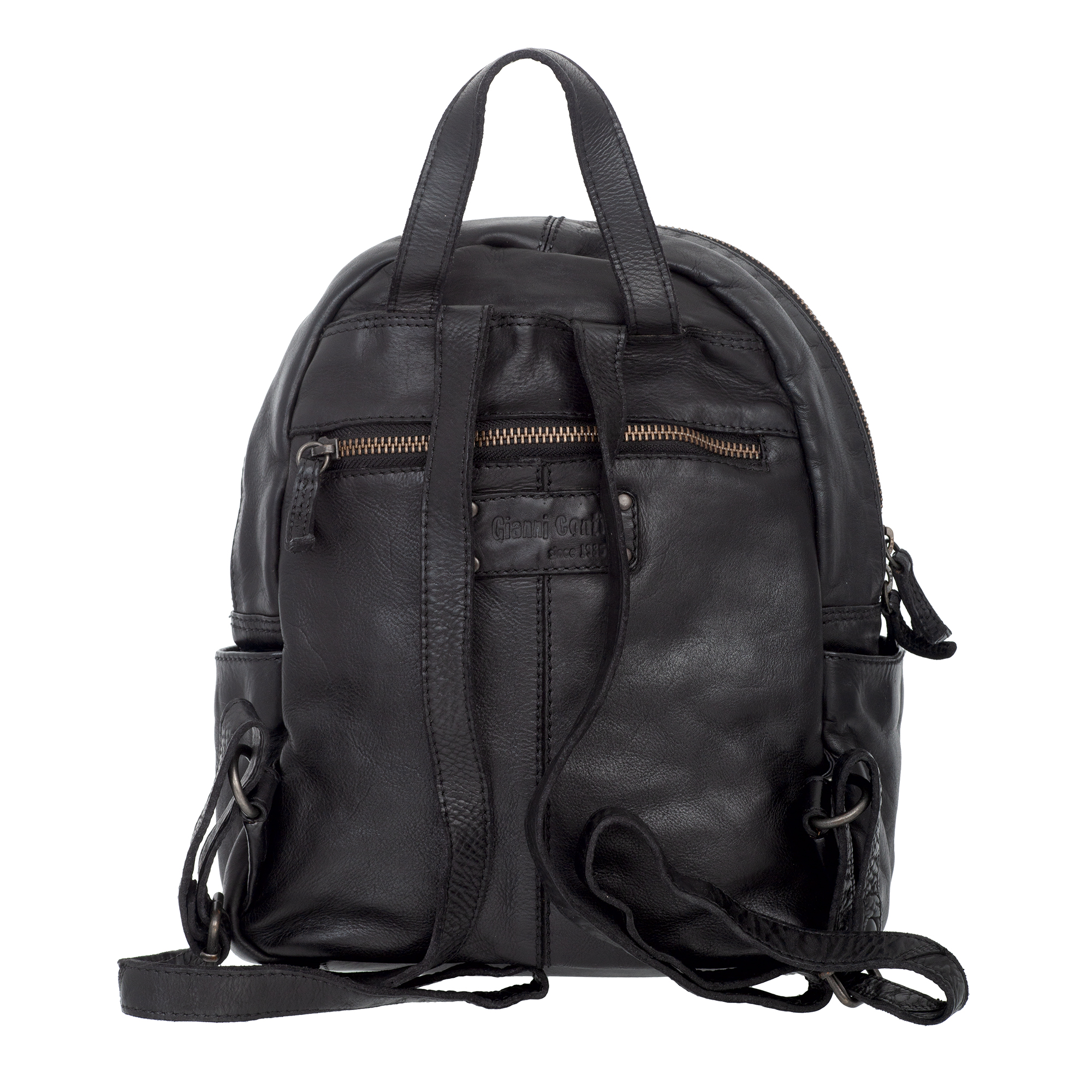 Стильный чёрный рюкзак из натуральной кожи от бренда Gianni Conti. Внутри одно большое отделение, в котором карман на молнии, карман на липучке, два кармашка для мелких предметов. Снаружи на передней стенке сквозной карман на двух молниях, на задней стенке карман на молнии. По бокам карманы для быстрого доступа. Рюкзак закрывается на двустороннюю молнию. Оснащён верхней ручкой и кожаными регулируемыми плечевыми лямками.
