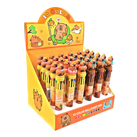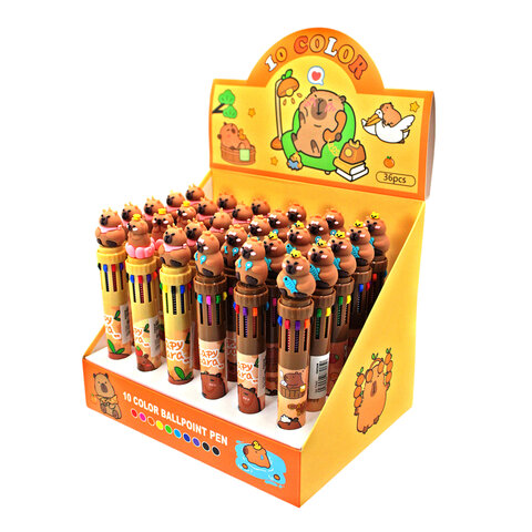 Ручка многоцветная с топпером шариковая 10 ЦВЕТОВ "Капибара", ассорти, линия 0,5 мм, 77427, 36шт.#S
