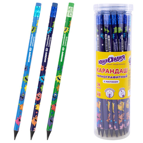 Карандаш чернографитный с принтом ЮНЛАНДИЯ МОНСТРИКИ, 1 шт., HB, с ластиком, корпус ассорти, 182014, 72шт.#S