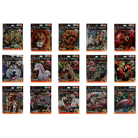 Гравюра в технике скретчинг, АССОРТИ 15 видов, 18х24 см, цветная основа, МУЛЬТИ АРТ, 5957, 15шт.#S