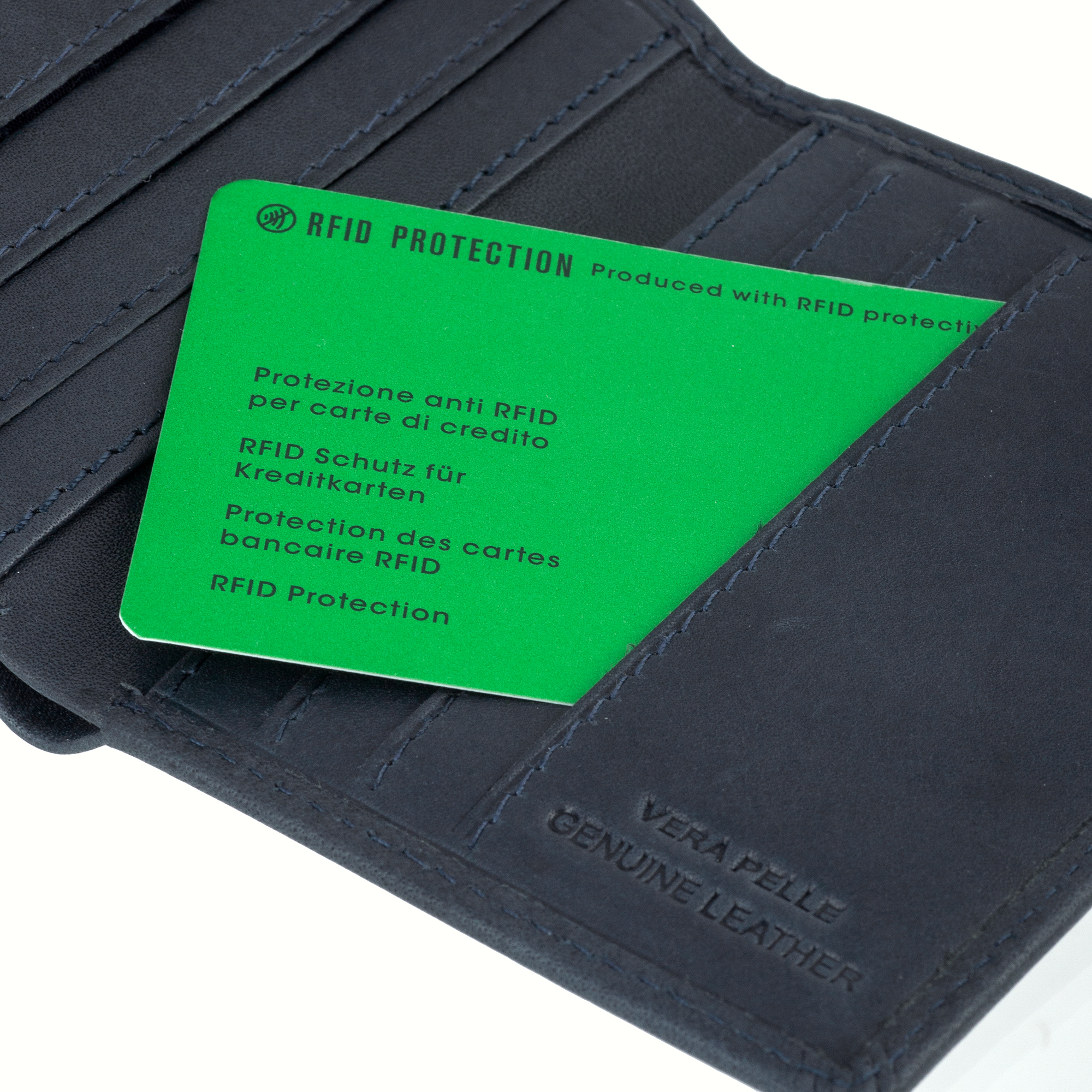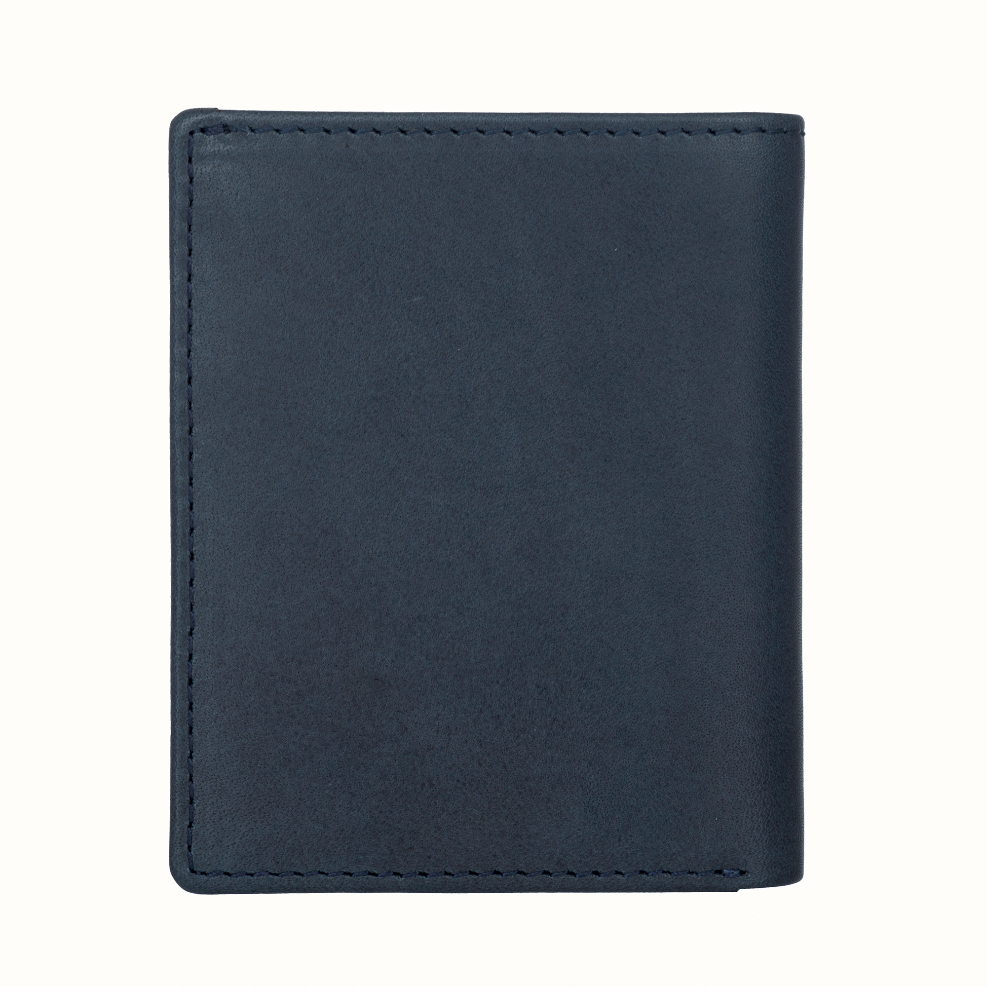 Портмоне из натуральной кожи синего цвета. Раскладывается пополам, внутри одно отделение для купюр,  шесть кармашков для пластиковых карт и два потайных кармана.