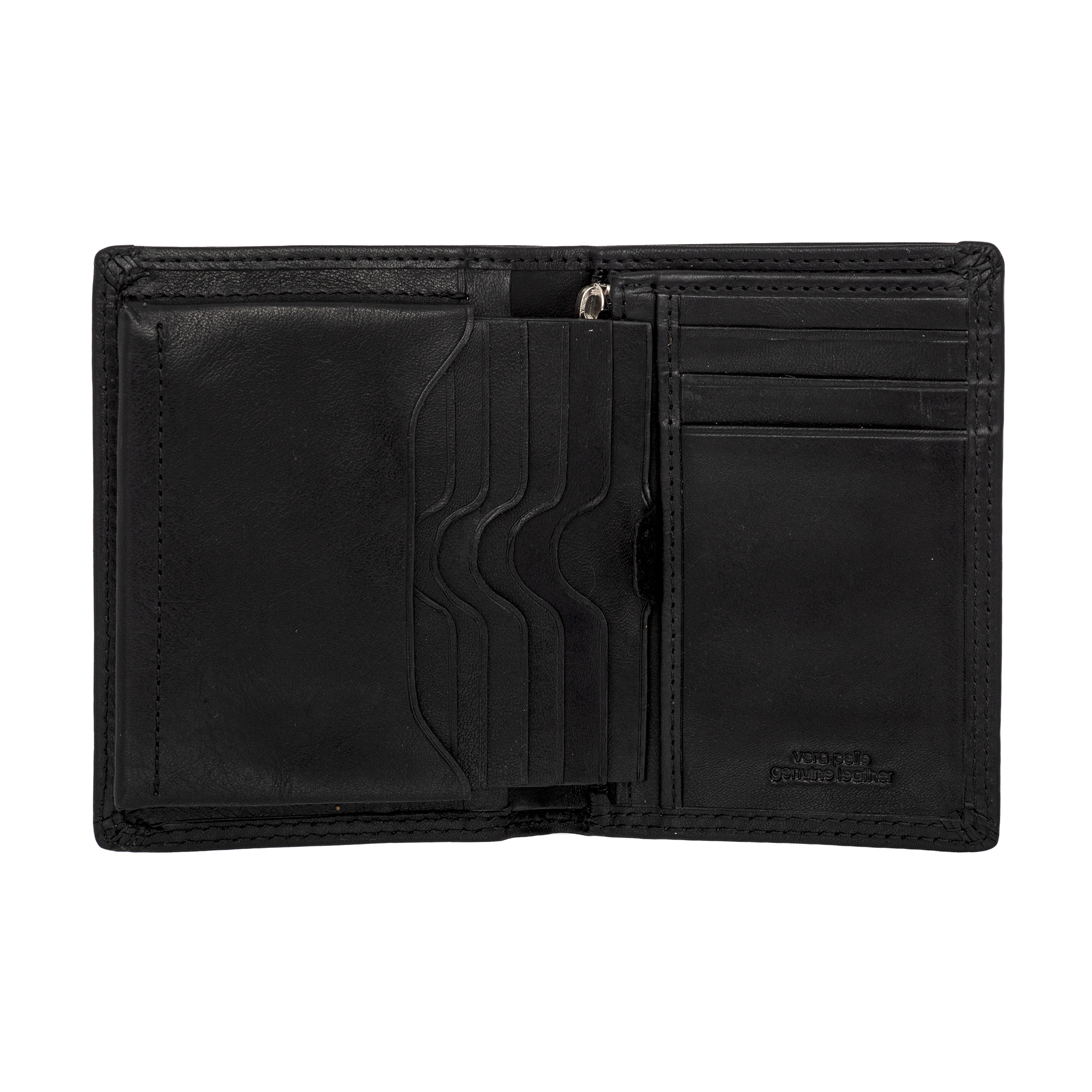 Портмоне выполнено из натуральной кожи, раскладывается пополам.Внутри один отдел для купюр, отдел для мелочи на молнии, два потайных кармана, три кармана для пластиковых карт, выдвижная визитница на шесть визиток.