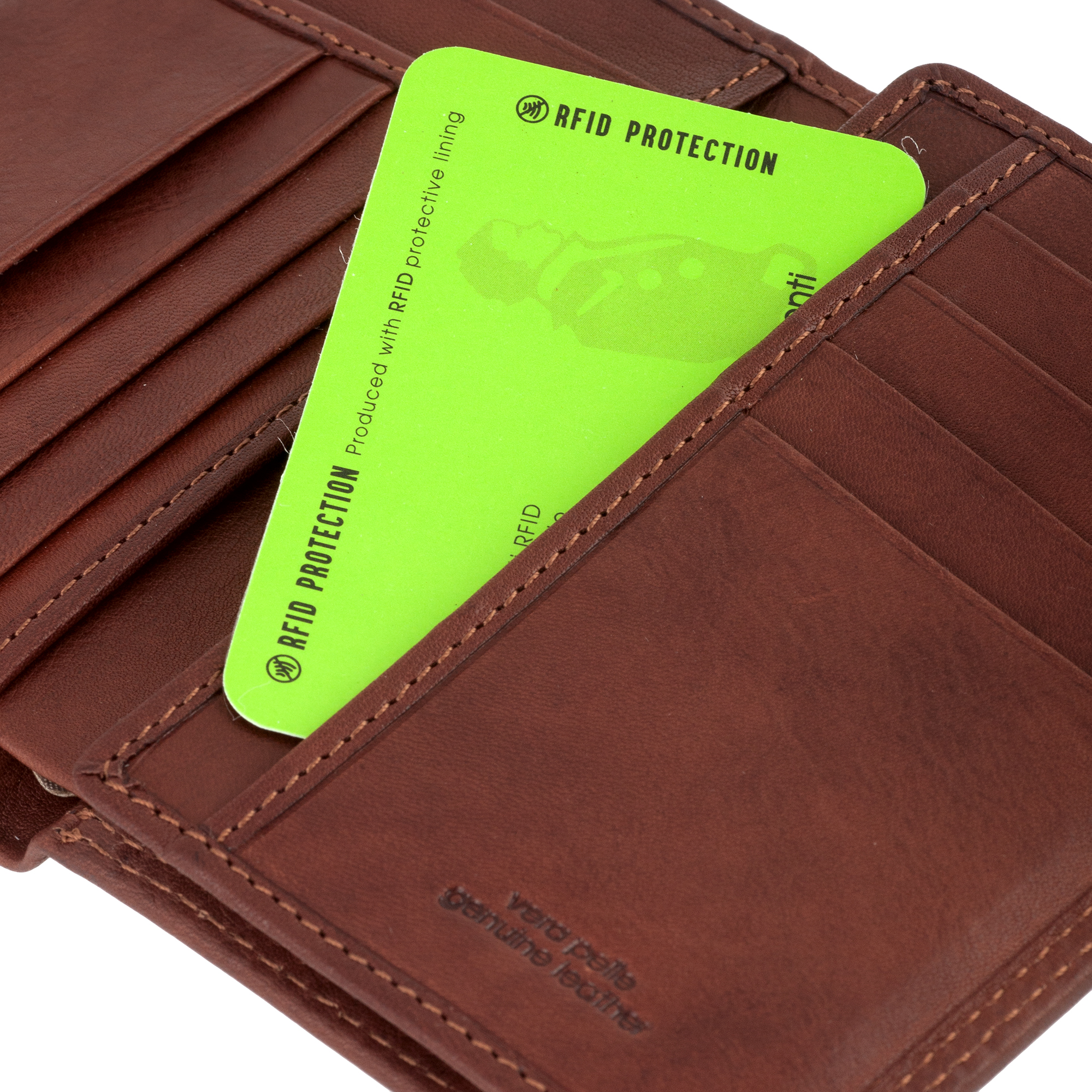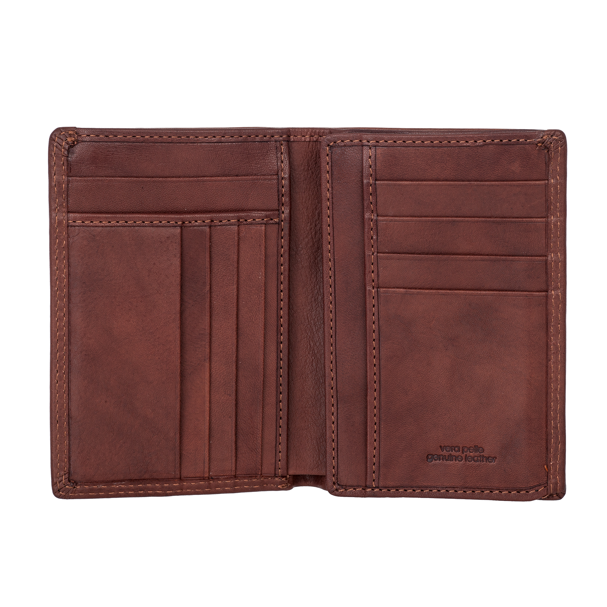 Портмоне раскладывается пополам. Внутри два отделения для купюр, два потайных кармана, два сетчатых кармана и десять кармашков для пластиковых карт.