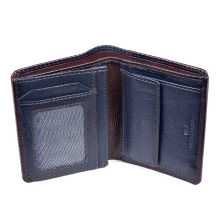 Мужское портмоне из натуральной кожи, раскладывается пополам, внутри два отдела для купюр, два потайных кармана, четыре кармашка для пластиковых карт, два сетчатых кармана, отдел для монет на кнопке. Оснащено RFID-защитой, что позволяет защитить банковские карты от считывания. Упаковано в подарочную жестяную коробку.