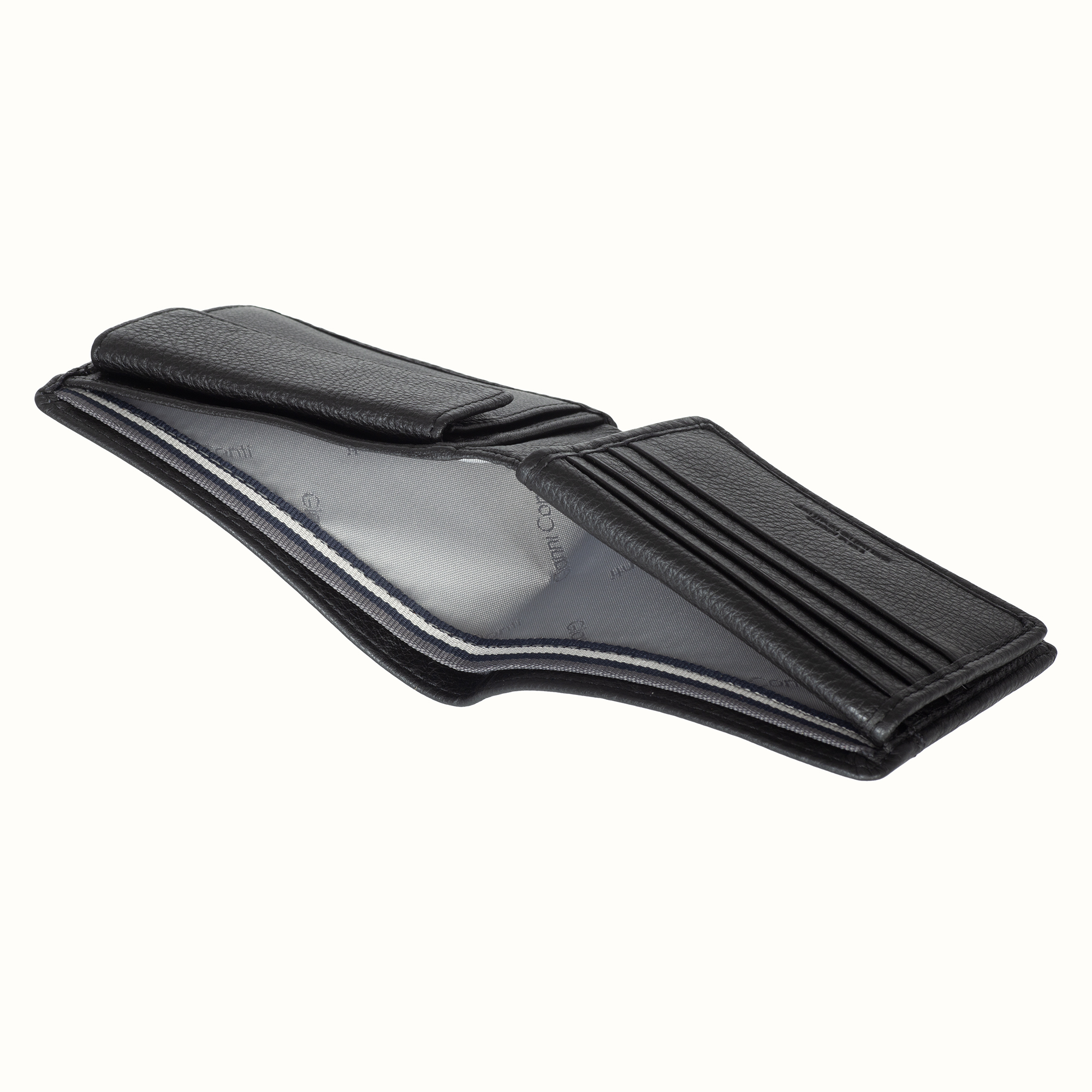 Мужское черное портмоне из натуральной кожи от бренда Gianni Conti. Внутри два отдела для купюр, карман для монет на кнопке, восемь кармашков для пластиковых карт, карман в сеточку и четыре потайных кармана.