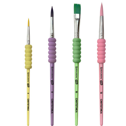 Кисти c EVA-вставкой НАБОР 4 шт. (синтетика круглые №4, 8, 12; плоская №10), блистер BRAUBERG KIDS, 201095, 12шт.#S