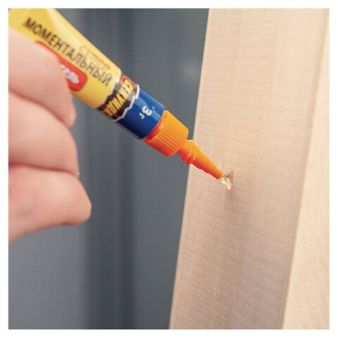 Обладает всеми преимуществами моментального клея, но, благодаря гелеобразной консистенции, применяется для склеивания изделий, изготовленных из различных металлов, пластмассы, винила, керамики, картона, дерева.