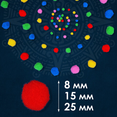 Помпоны для творчества, ассорти, 5 цветов, 8 мм/15 мм/25 мм, 100 шт., ОСТРОВ СОКРОВИЩ, 661436, 12шт.#S