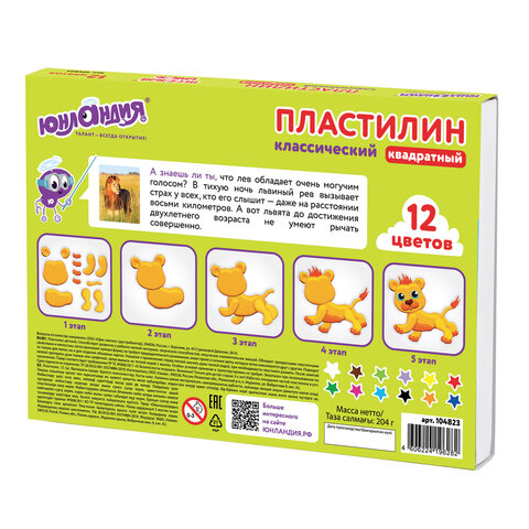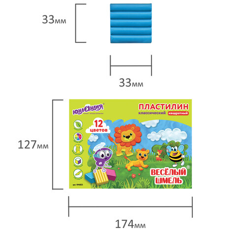 Пластилин классический ЮНЛАНДИЯ "ВЕСЁЛЫЙ ШМЕЛЬ", 12 цветов, 204 г, СО СТЕКОМ, КВАДРАТНЫЙ, 104823, 14шт.#S