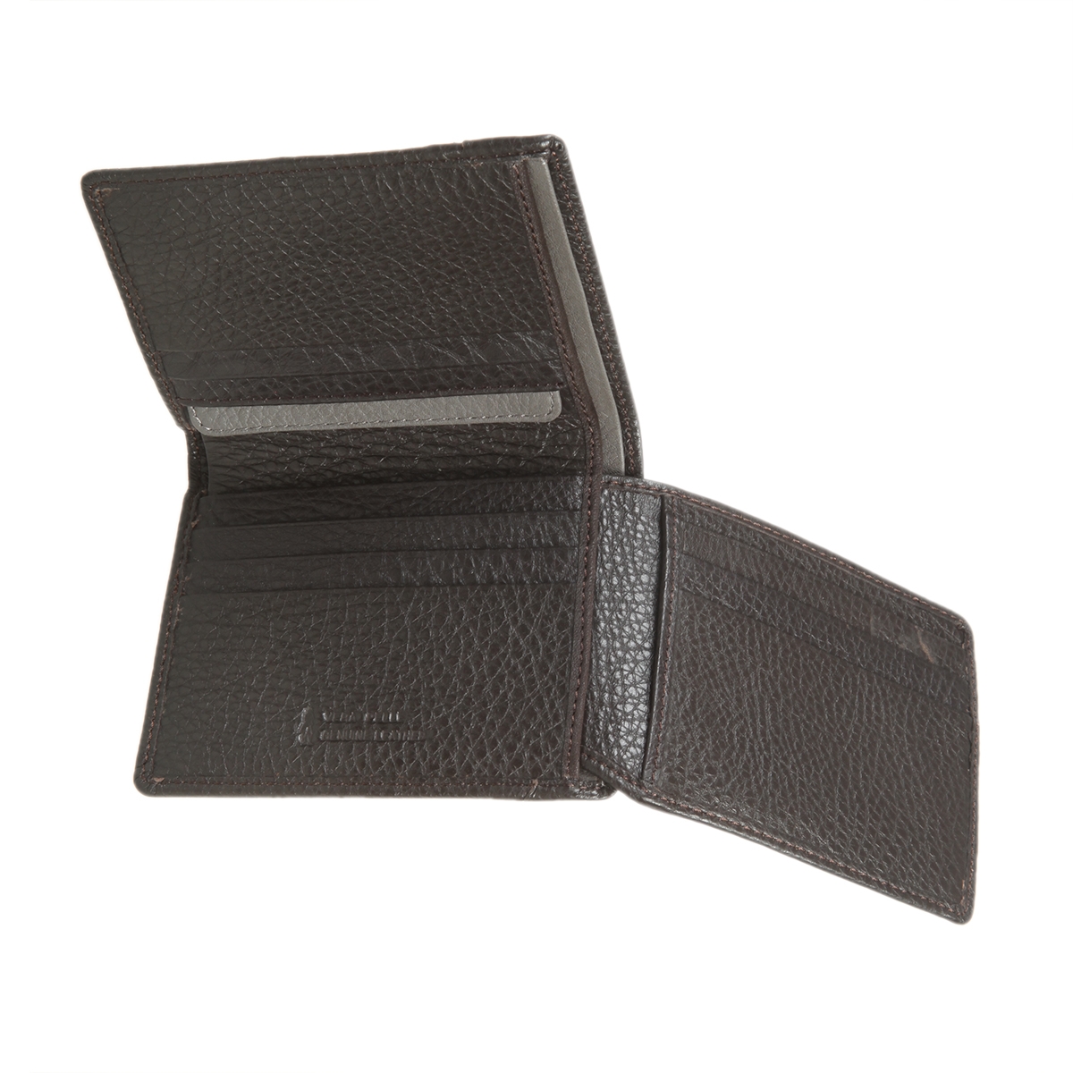 Внутри два отделения для купюр, четыре кармана для документов, сетчатый карман и девять кармашков для пластиковых карт. Имеет защитный слой от считывания карт RFID-Protection.