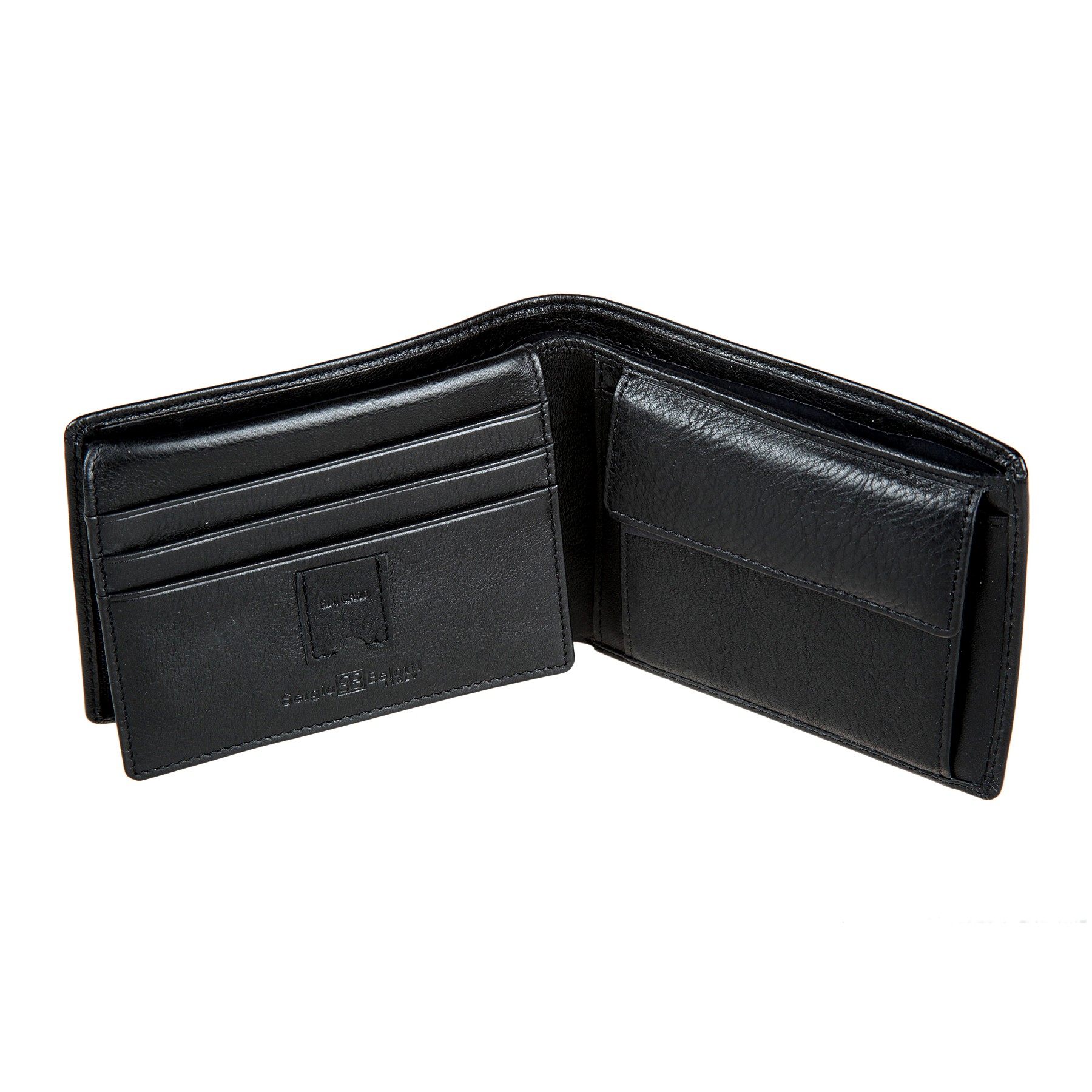 Функциональное портмоне из мягкой натуральной кожи NAPPA. Раскладывается пополам. Внутри два отделения для купюр, карман для монет на кнопке, один потайной карман, два кармана в сеточку, три кармашка для пластиковых карт и кармашек для SIM-карты. Товар упакован в подарочную коробку от бренда Sergio Belotti.