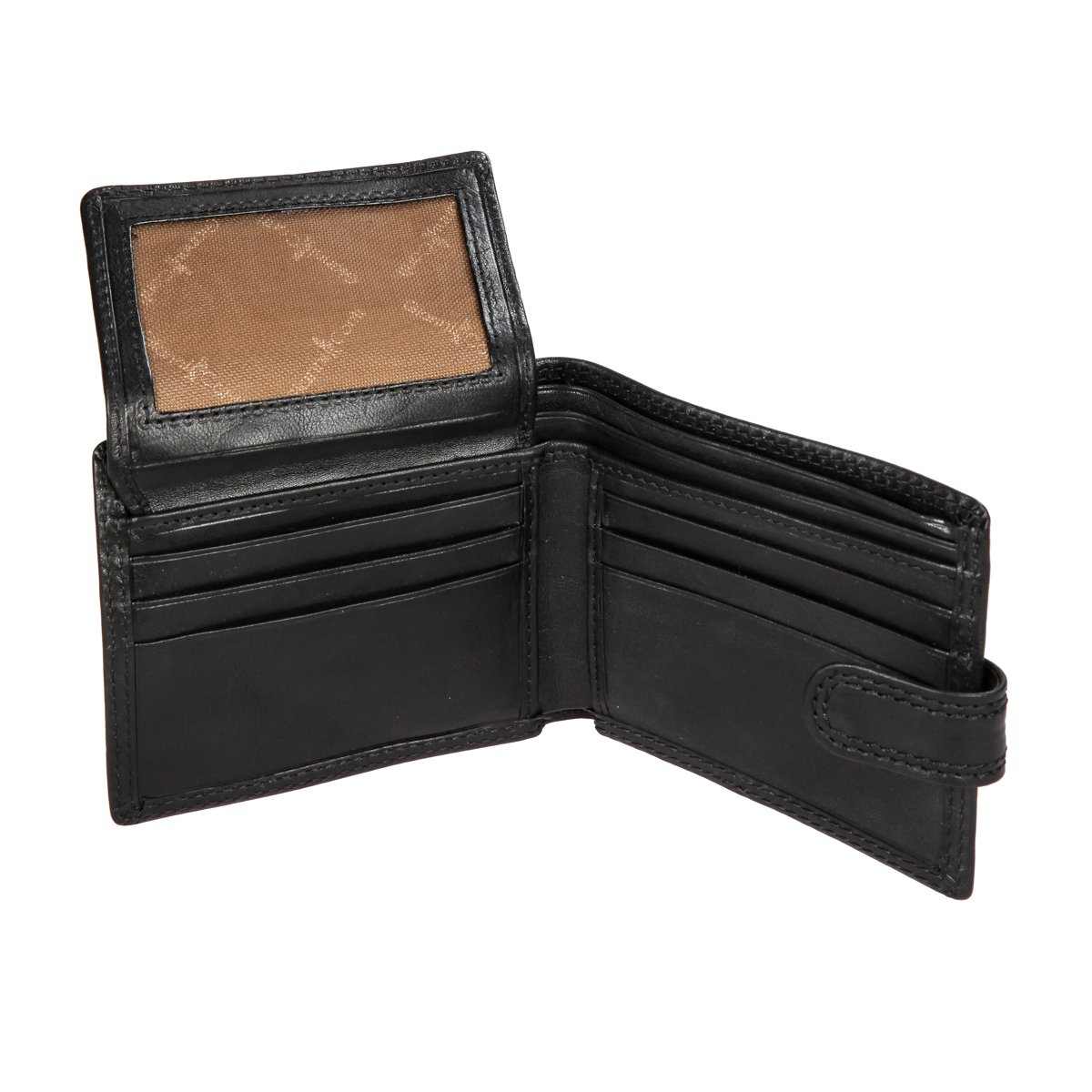 Портмоне закрывается клапаном на кнопке. Внутри три отдела для купюр, сетчатый карман, два кармана для документов, девять кармашков для пластиковых карт. Имеет RFID Protection (защитный слой от считывания карт).