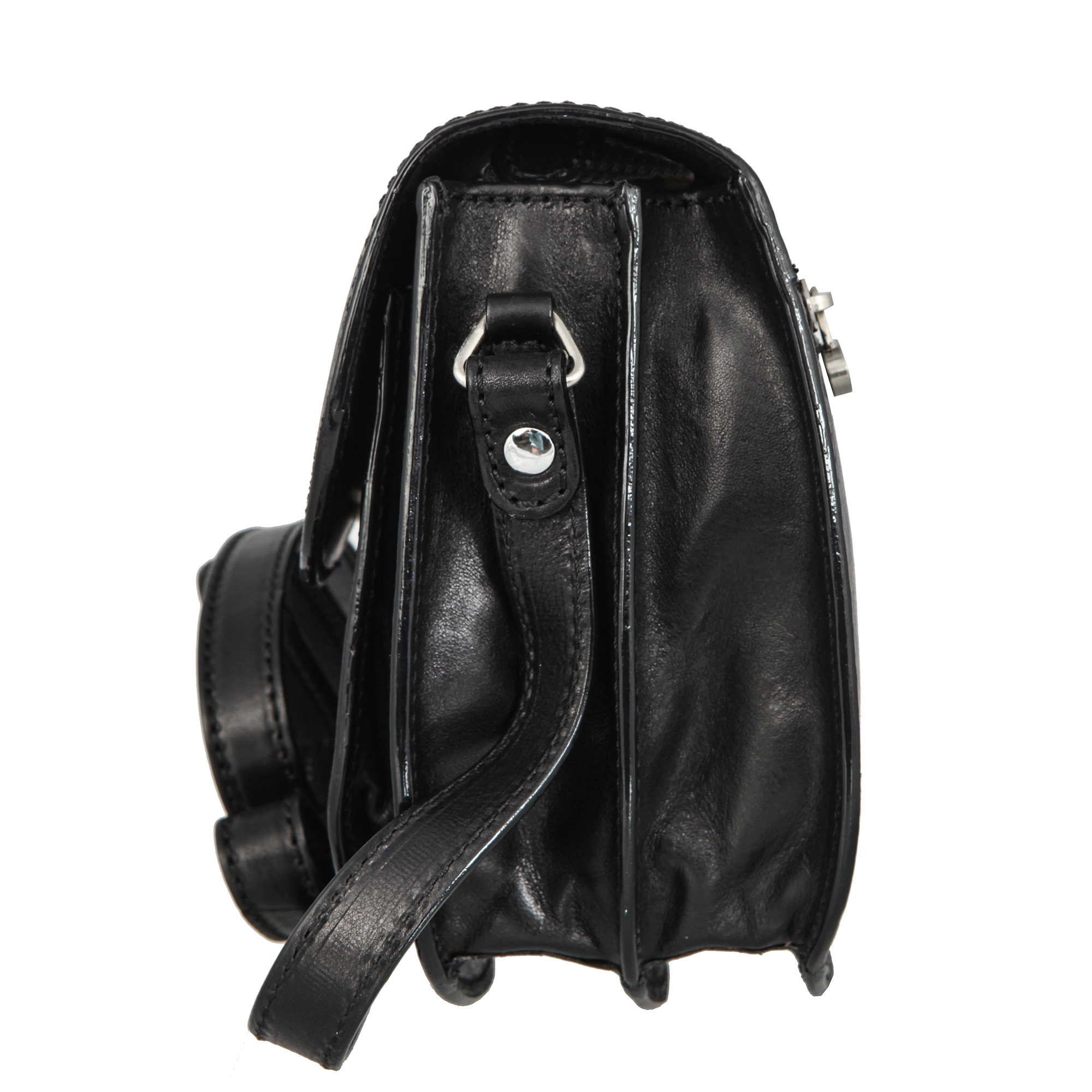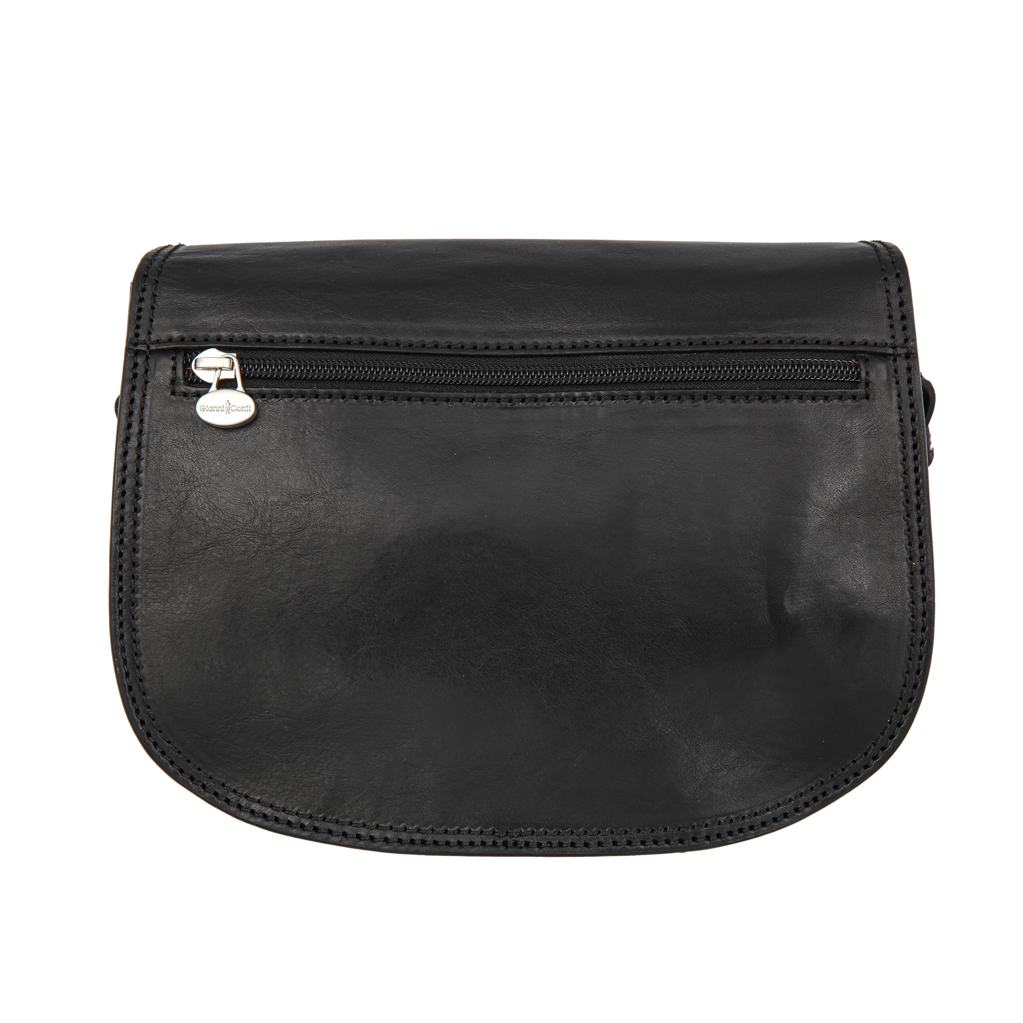 Женская сумка через плечо из натуральной кожи чёрного цвета. Внутри два основных отделения, одно из них на молнии, кармашек для телефона и карман для документов на молнии. На передней стенке накладной карман для мелких предметов, на задней стенке карман на молнии. Оснащена регулируемым плечевым ремнём.