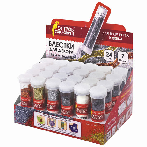 Блестки (глиттер) для декора, поделок, DIY, творчества, оформления, ОСТРОВ СОКРОВИЩ, МЕТАЛЛИК, 7 грамм, ассорти, в дисплее, 662220, 24шт.#S