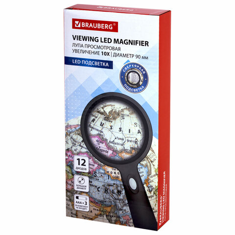 Лупа просмотровая с LED-ПОДСВЕТКОЙ, диаметр 90 мм, увеличение 10, корпус черный, BRAUBERG, 455928, 2шт.#S