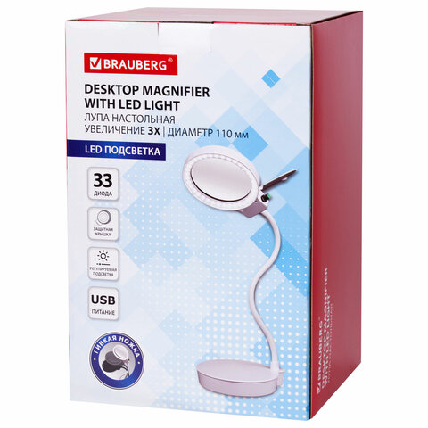 Лупа настольная с LED-ПОДСВЕТКОЙ, диаметр 110 мм, увеличение 3, корпус белый, BRAUBERG, 455930#S