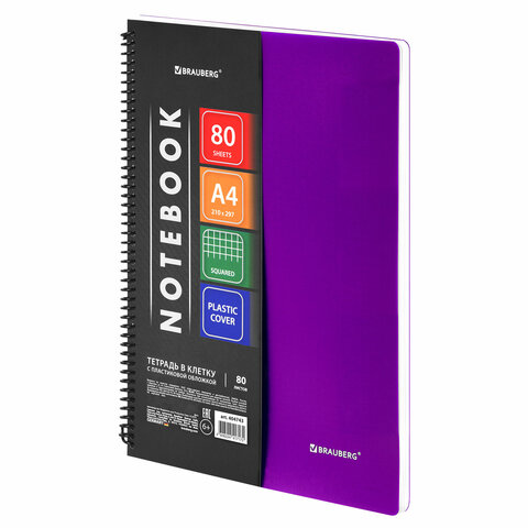 Тетрадь обложка пластик, А4, 80 л., спираль пластик, клетка, BRAUBERG "Metropolis", фиолетовый, 404743, 6шт.#S