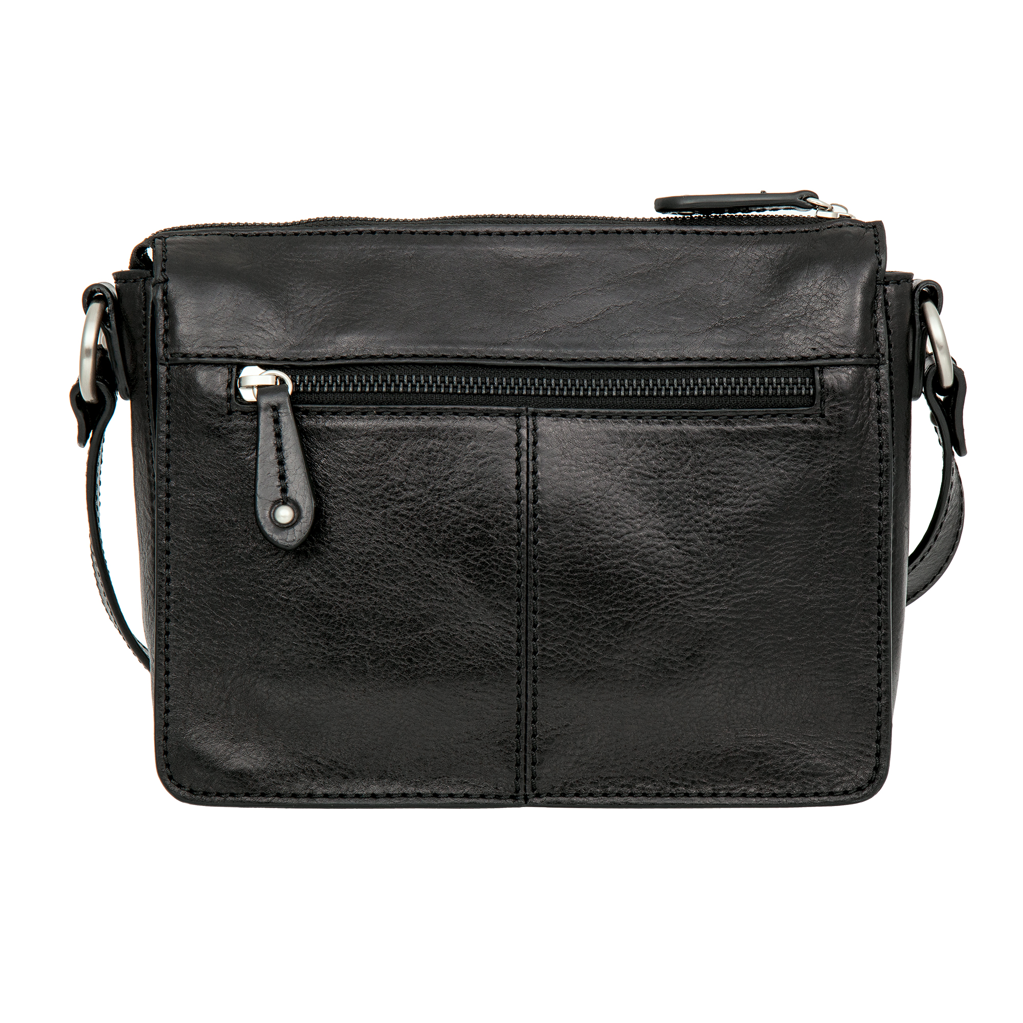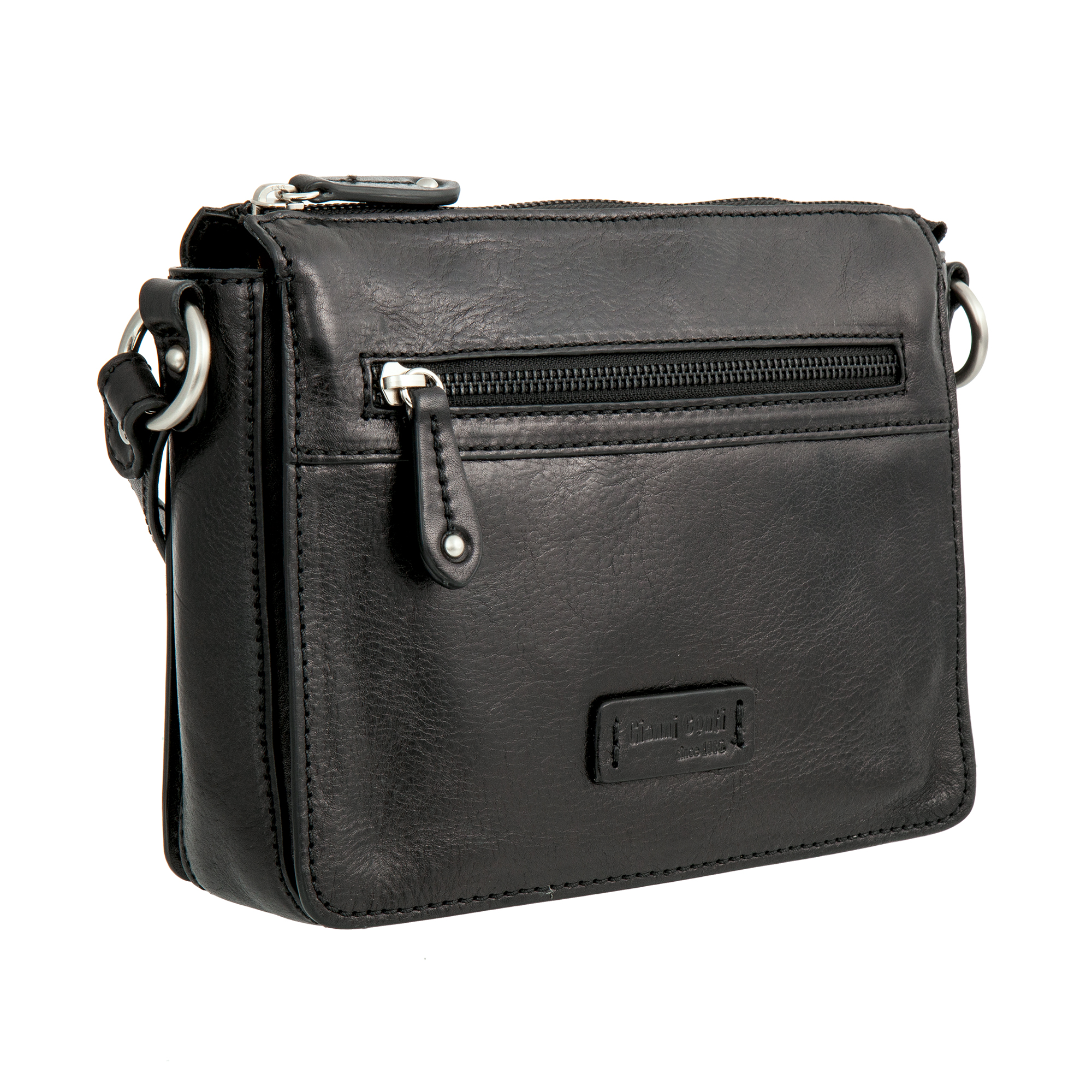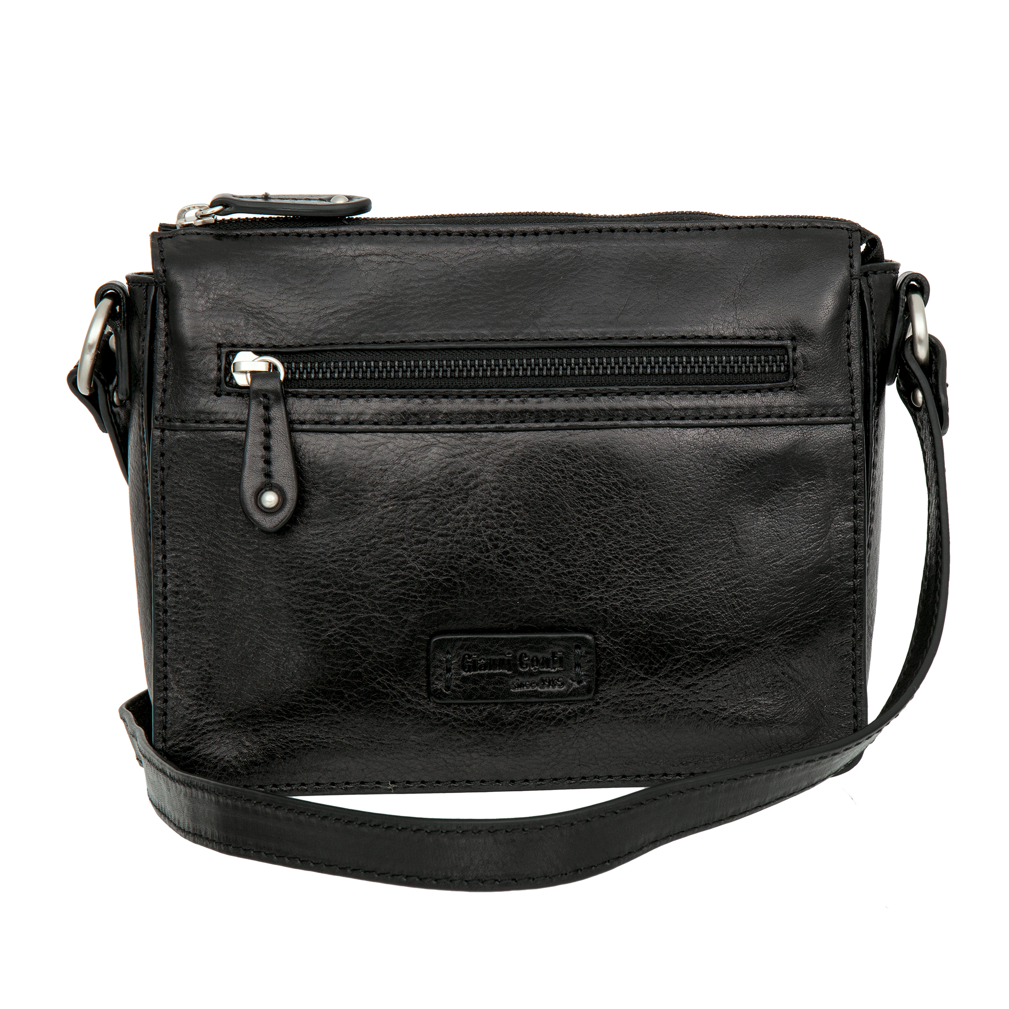 Женская чёрная кожаная сумка через плечо от Gianni Conti. Закрывается на молнию. Внутри три отделения, в которых расположены карман для телефона, кармашек для мелких предметов, карман на молнии и один открытый карман. На лицевой и внутренней сторонах карманы на молниях. Сумка оснащена кожаным плечевым ремешком. Размеры: 19 х 22.5 х 6 см.