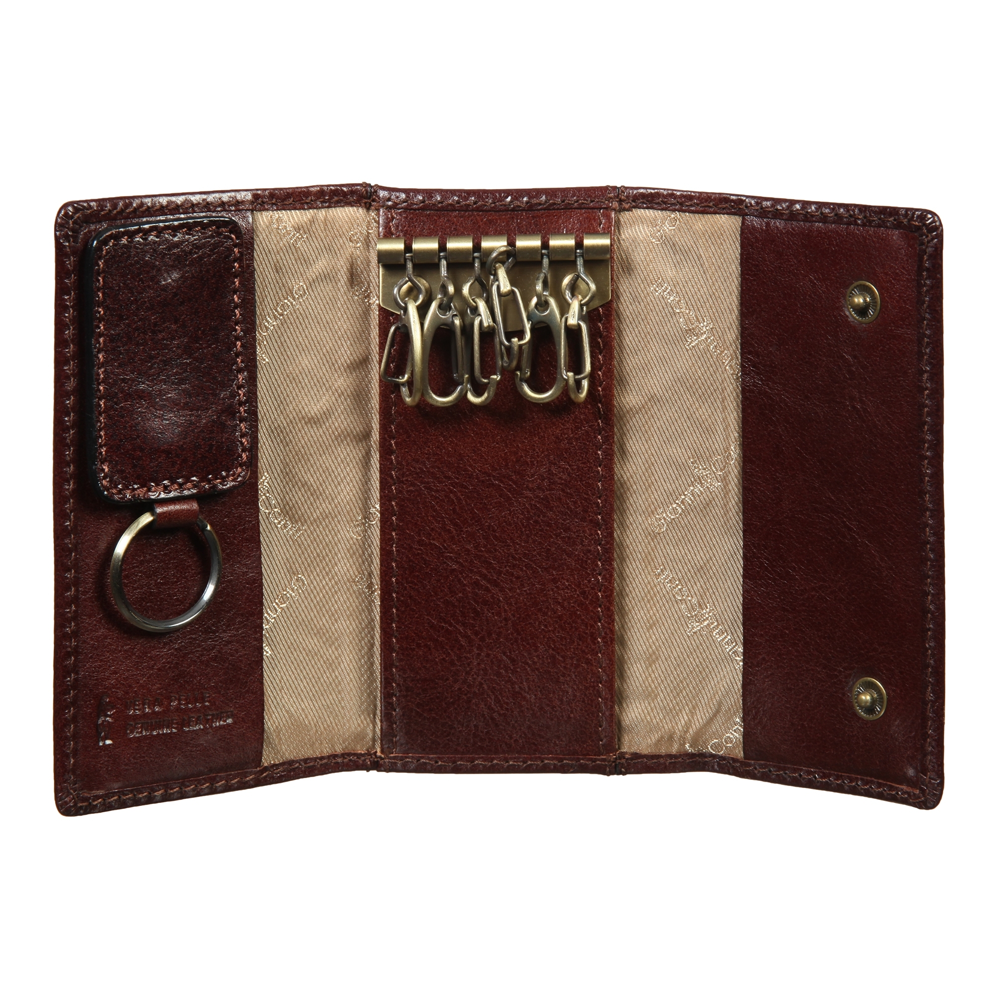 Ключница на 6 ключей, закрывается клапаном на двух кнопках, внутри шесть колец, съемный кожаный брелок для ключа домофона, два кармашка.