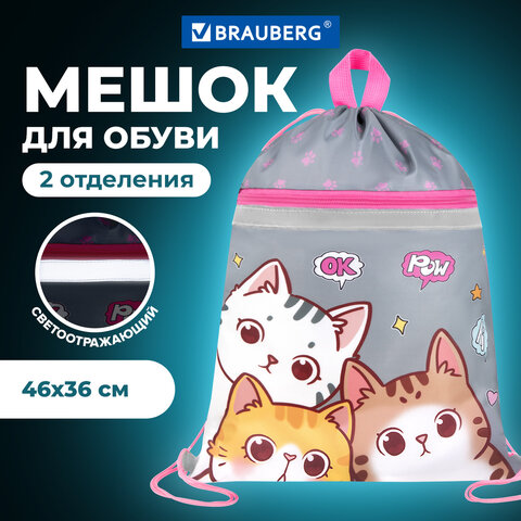 Мешок для обуви BRAUBERG, с петлей, светоотражающая полоса, 2 отделения, 46х36 см, "Hi there", 273449, 3шт.#S