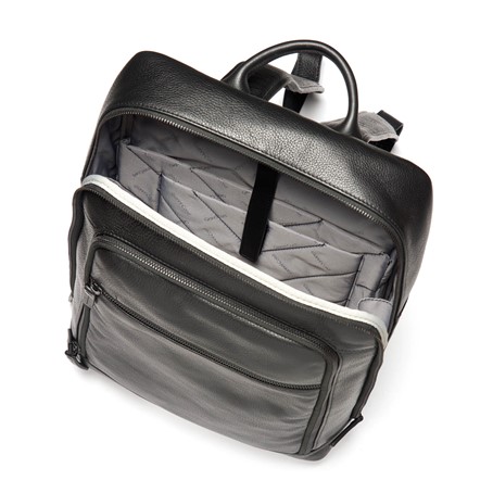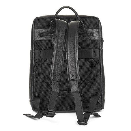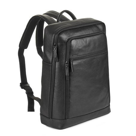 Рюкзак Gianni Conti из натуральной кожи, черного цвета, с двумя отделами на двойной молнии. Внутри имеется двойное отделение для планшета или ноутбука на липучке, карман на молнии, два кармашка для мелких предметов, держатель для авторучки. С внешней стороны на лицевой стенке карман на молнии. Имеется ручка и регулируемые плечевые лямки. Сзади имеется приспособление для крепления на ручку чемодана и карман на молнии.