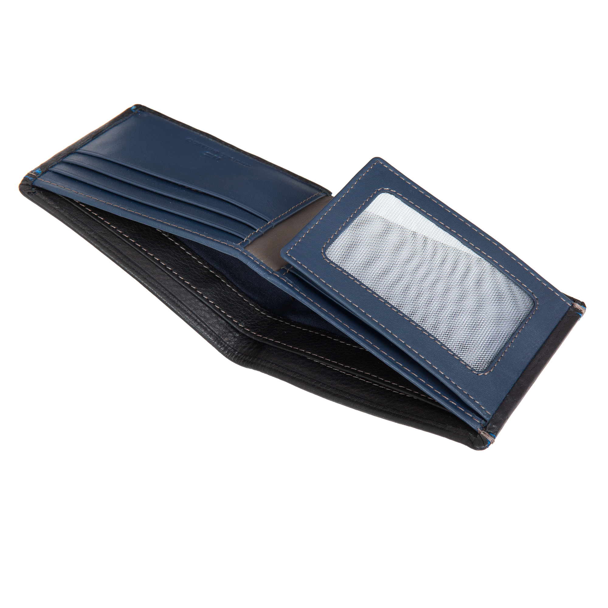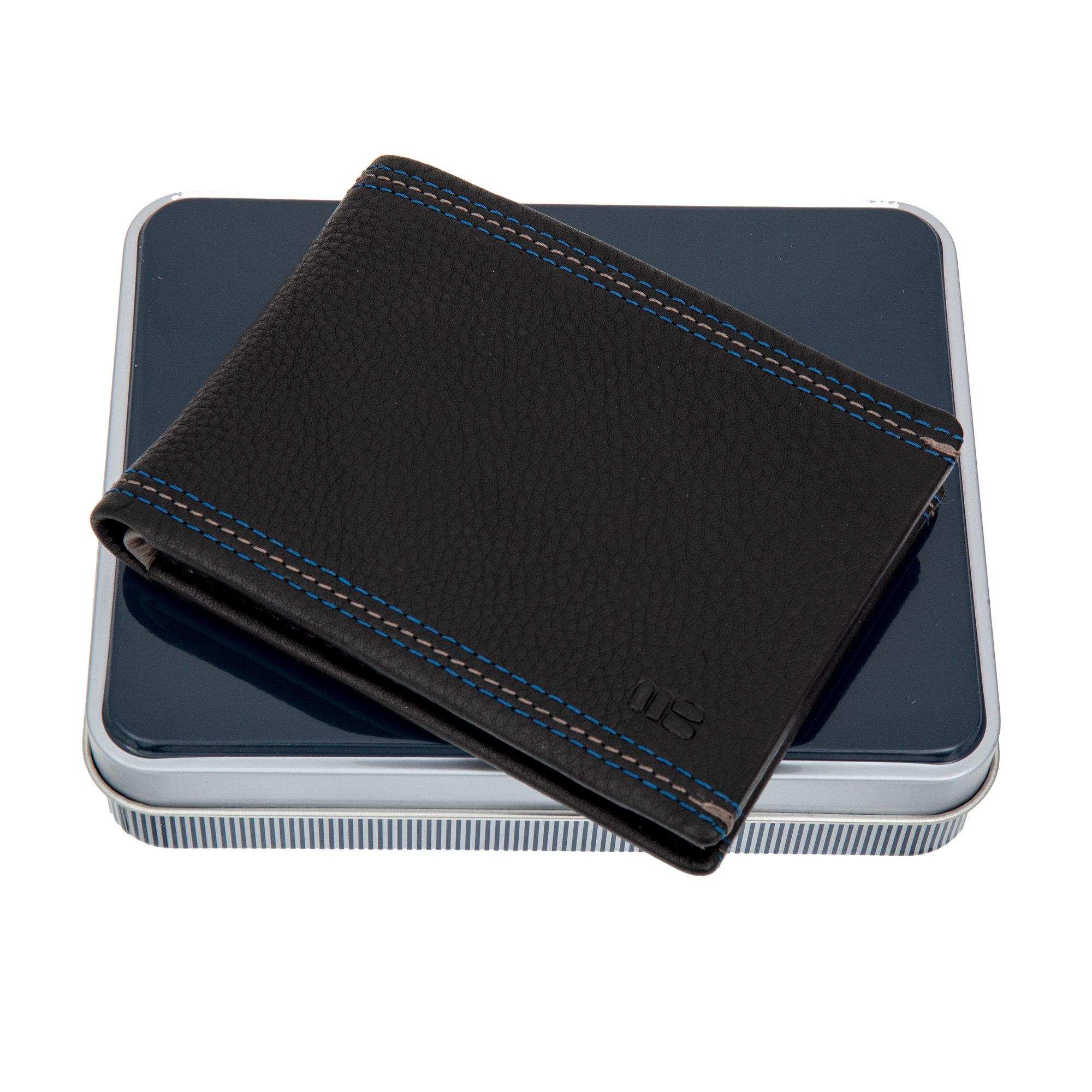 Мужское портмоне из натуральной кожи, раскладывается пополам, внутри два отделения для купюр, два потайных кармана, шесть кармашков для пластиковых карт, сетчатое отделение для пропуска. Оснащено RFID-защитой, что позволяет защитить банковские карты от считывания. Упаковано в подарочную жестяную коробку.