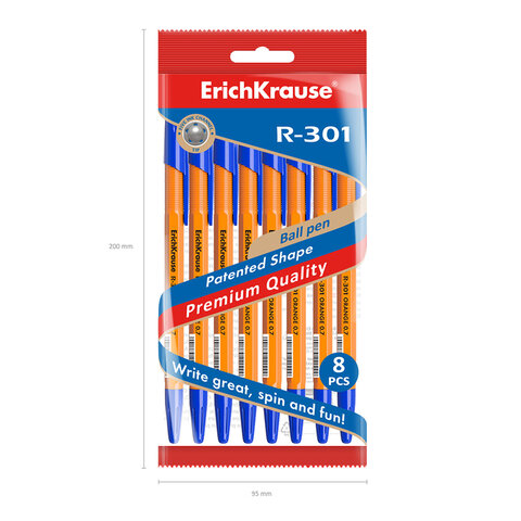 Ручки шариковые ERICH KRAUSE R-301 "Stick Orange", СИНИЕ, набор 8 штук, 0,7 мм, 56614, 12шт.#S
