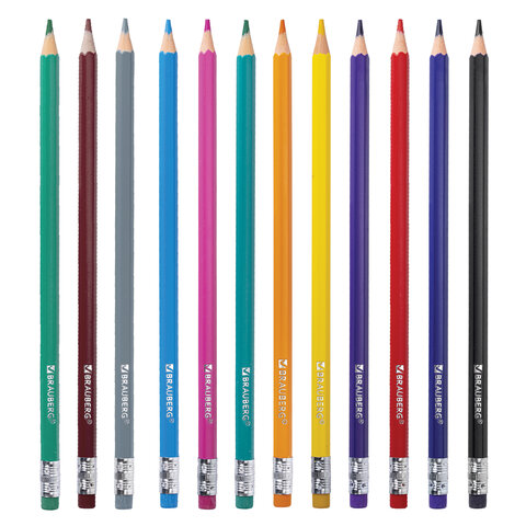 Карандаши цветные стираемые с ластиком BRAUBERG, 12 цветов, шестигранные, 182070, 12шт.#S