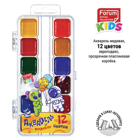 Краски акварельные FORUM "КОСМО", медовые, 12 цветов, квадратные кюветы, прозрачный пластик, FA-EV-1012-Aln, 12шт.#S