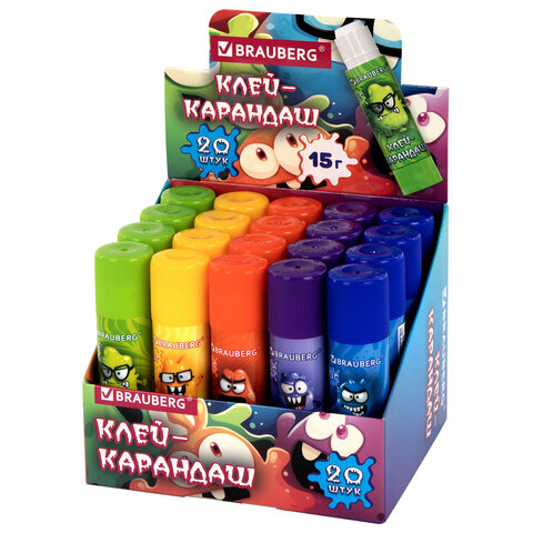 Клей-карандаш 15 г, кросс-серия МОНСТРИКИ, ассорти, BRAUBERG, 273237, 20шт.#S