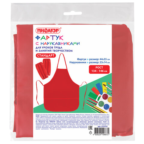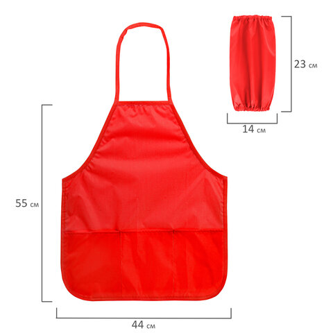 Фартук с нарукавниками для уроков труда ПИФАГОР, 3 кармана, стандартный размер, 44x55 см, красный, 273753, 4шт.#S