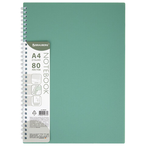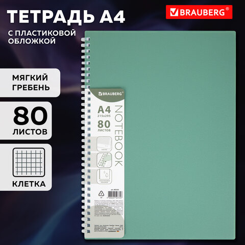 Тетрадь обложка пластик, А4 80 л., гребень мягкий (силиконовый), клетка, BRAUBERG, зеленая, 405355, 5шт.#S