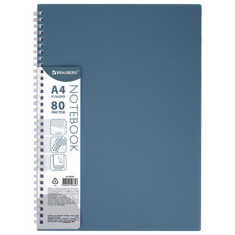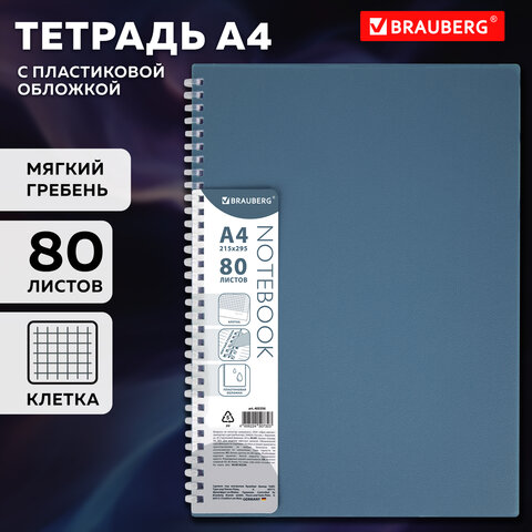 Тетрадь обложка пластик, А4 80 л., гребень мягкий (силиконовый), клетка, BRAUBERG, синий, 405356, 5шт.#S