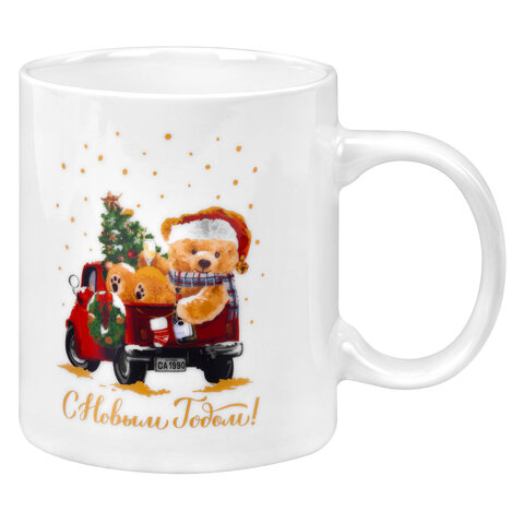 Кружка новогодняя 330 мл, "Мишка на машинке", 8х9,5 см, каменная керамика, ЗОЛОТАЯ СКАЗКА, 592543, 4шт.#S