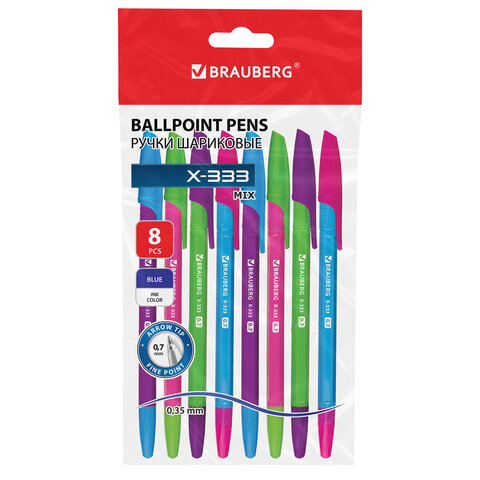 Ручки шариковые BRAUBERG "X-333 NEON MIX", НАБОР 8 ШТУК, СИНИЕ, узел 0,7 мм, линия 0,35 мм, 144536, 10шт.#S