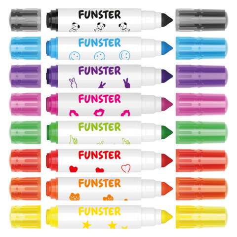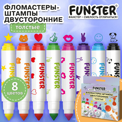 Фломастеры-штампы двусторонние FUNSTER помогут развить творческие способности у детей! Утолщенные двусторонние фломастеры имеют 2 вида наконечника: с одной стороны конической формы, с другой – наконечники-штампы с восьмью разными картинками.