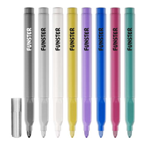 Фломастеры FUNSTER "METALLIC" с эффектом металлик. Чернила на водной основе практически не имеют запаха, не токсичны и легко смываются с большинства материалов и тканей.