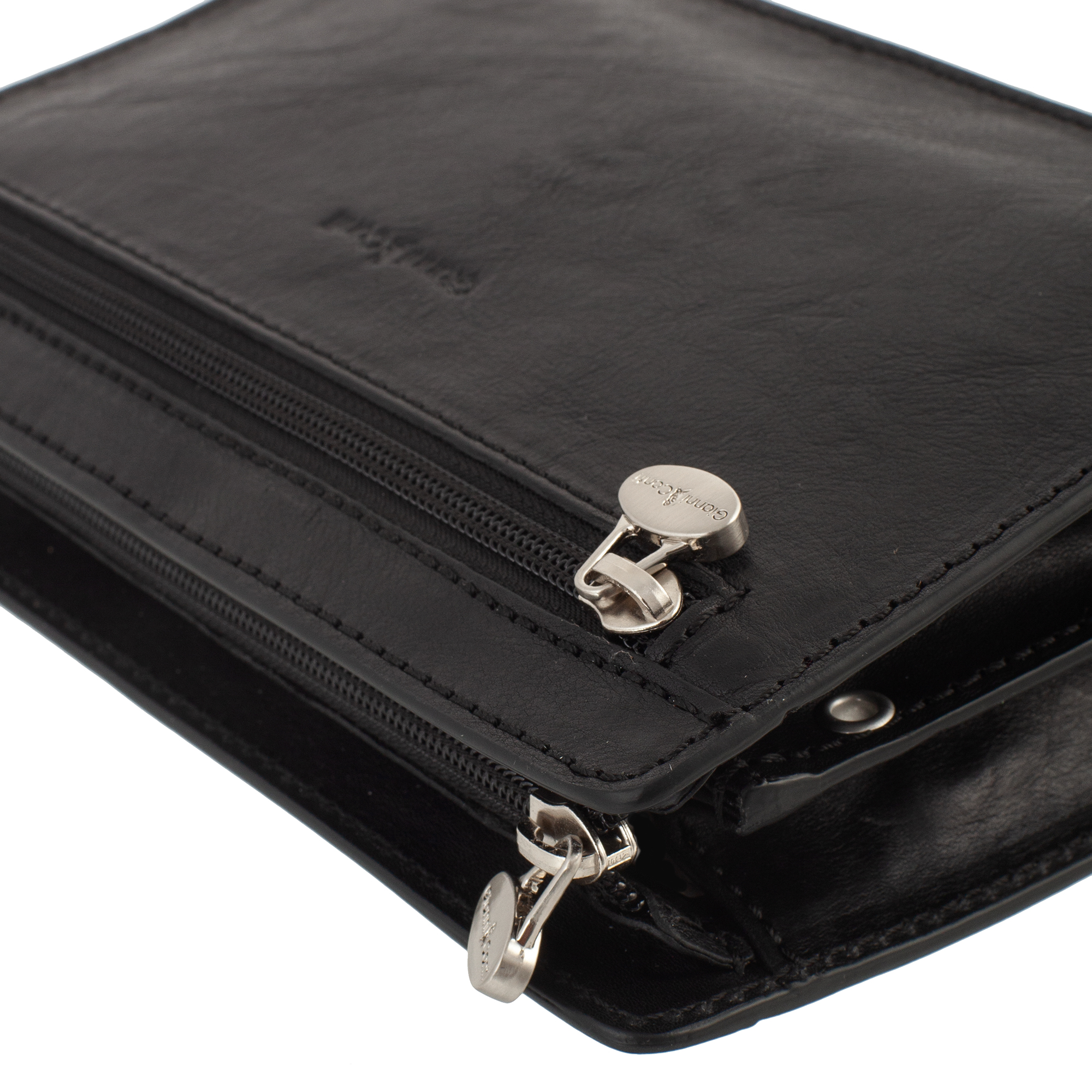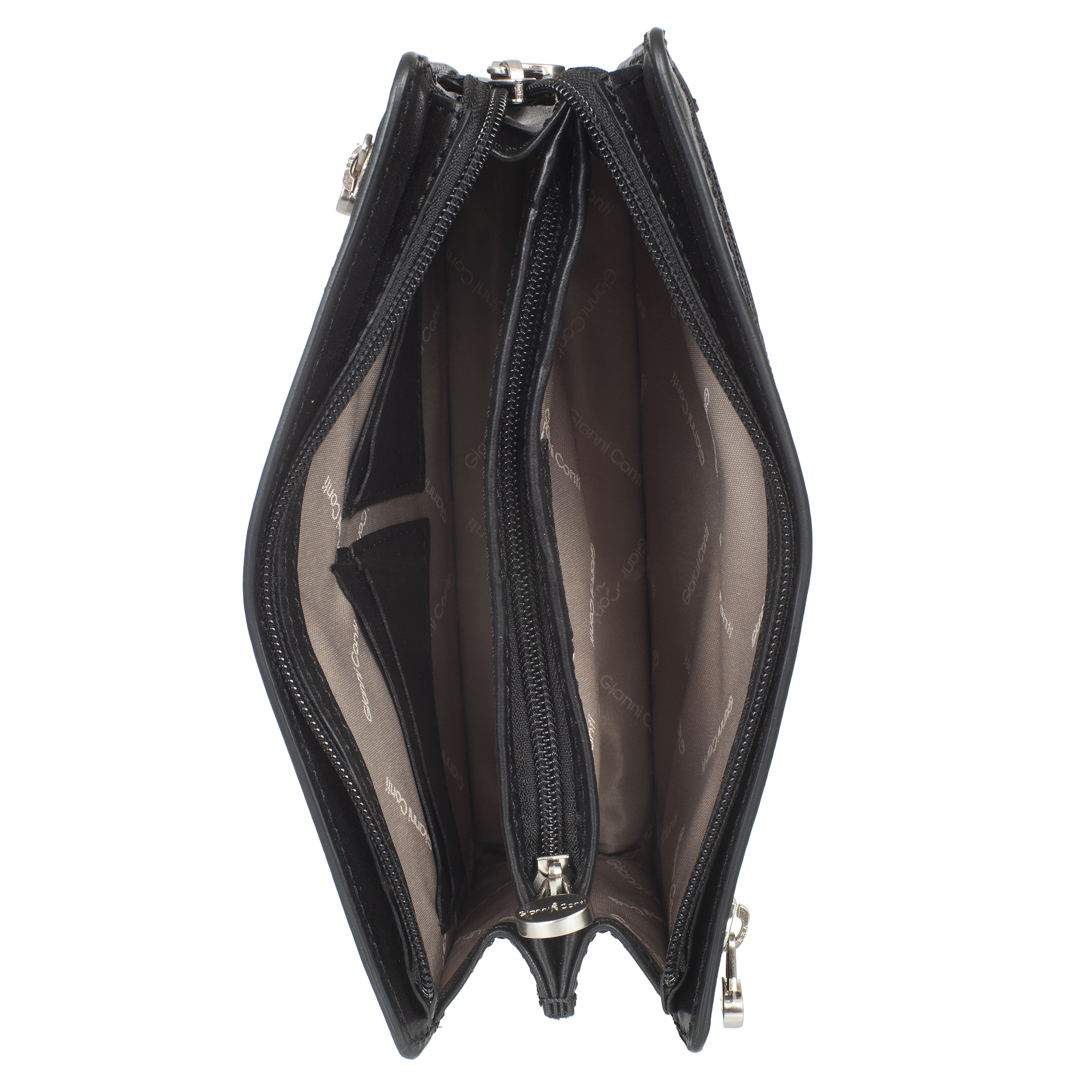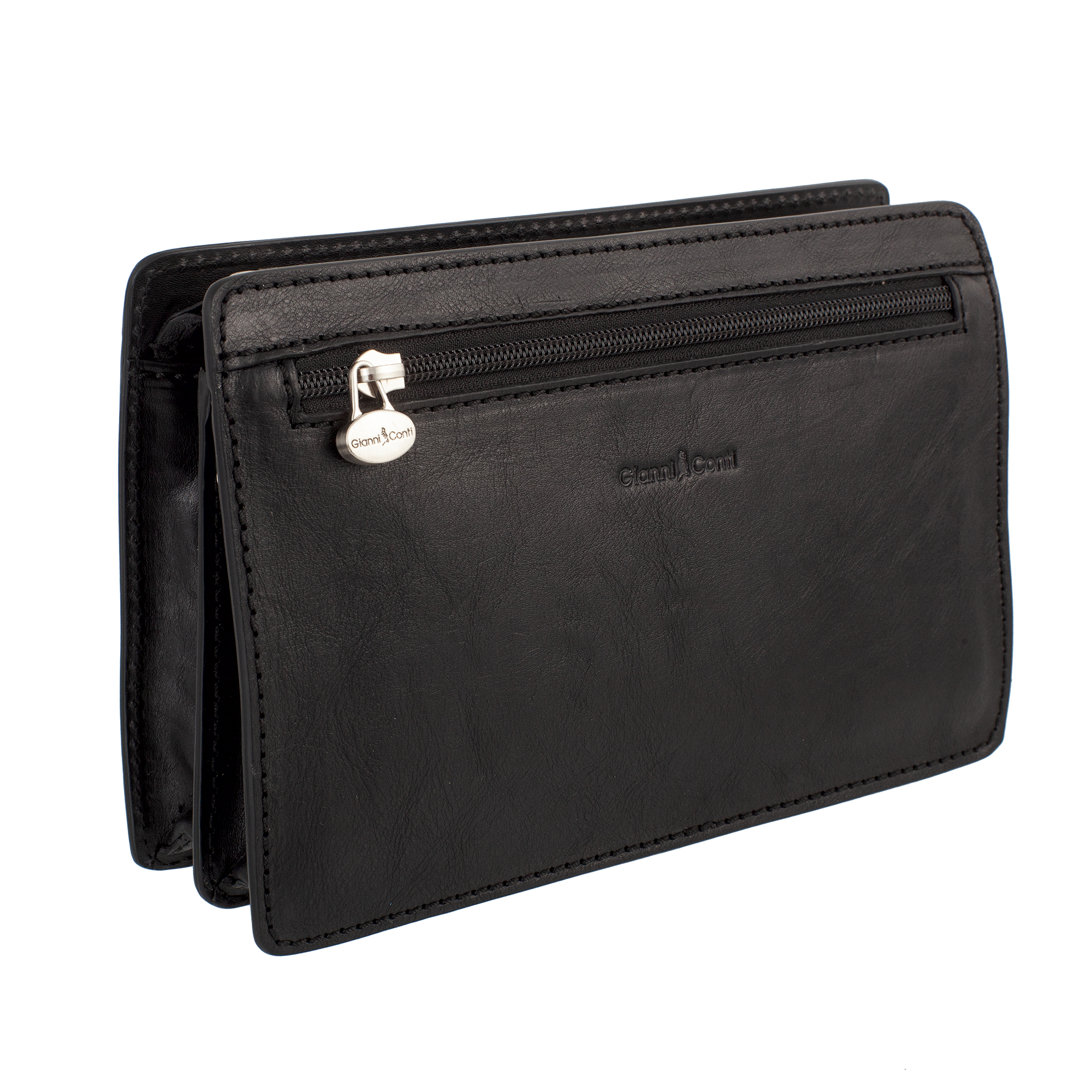 Борсетка мужская Gianni Conti из натуральной кожи, черного цвета. Внутри три отдела, один из них на молнии,  в которых расположены четыре кармашка для пластиковых карт. Снаружи на лицевой и задней стенке карманы на молнии. Закрывается на молнию. Оснащена съёмным ремешком на запястье.
