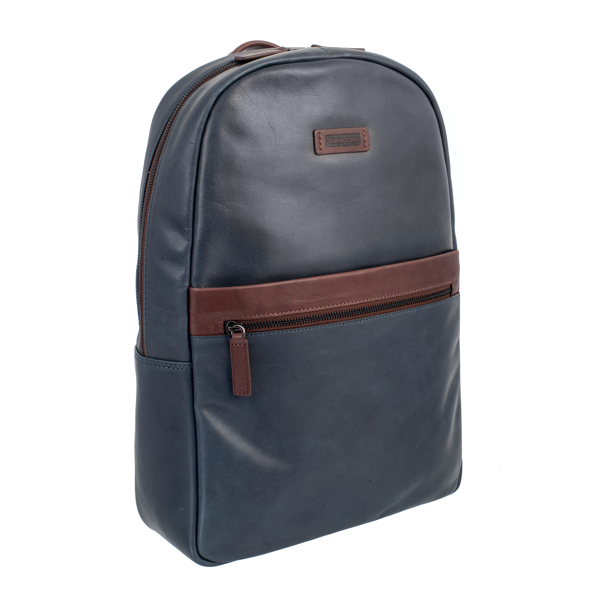 Рюкзак Gianni Conti из натуральной кожи, синего цвета, с одним отделом на двойной молнии. В основном отделении имеется отделение для планшета или ноутбука на липучке, карман на молнии, три кармашка для мелких предметов.  С внешней стороны на лицевой стенке два кармана на молнии. Имеется ручка и регулируемые плечевые лямки. Сзади имеется приспособление для крепления на ручку чемодана.