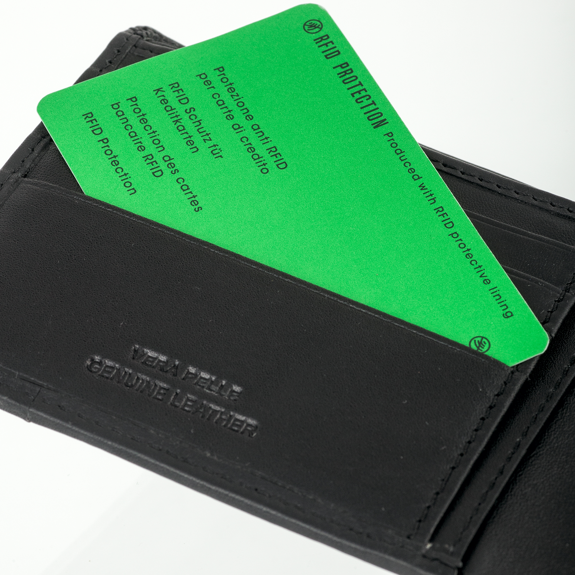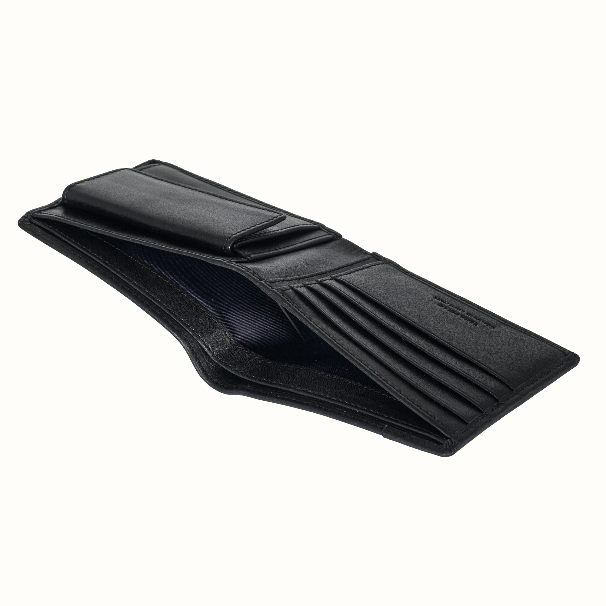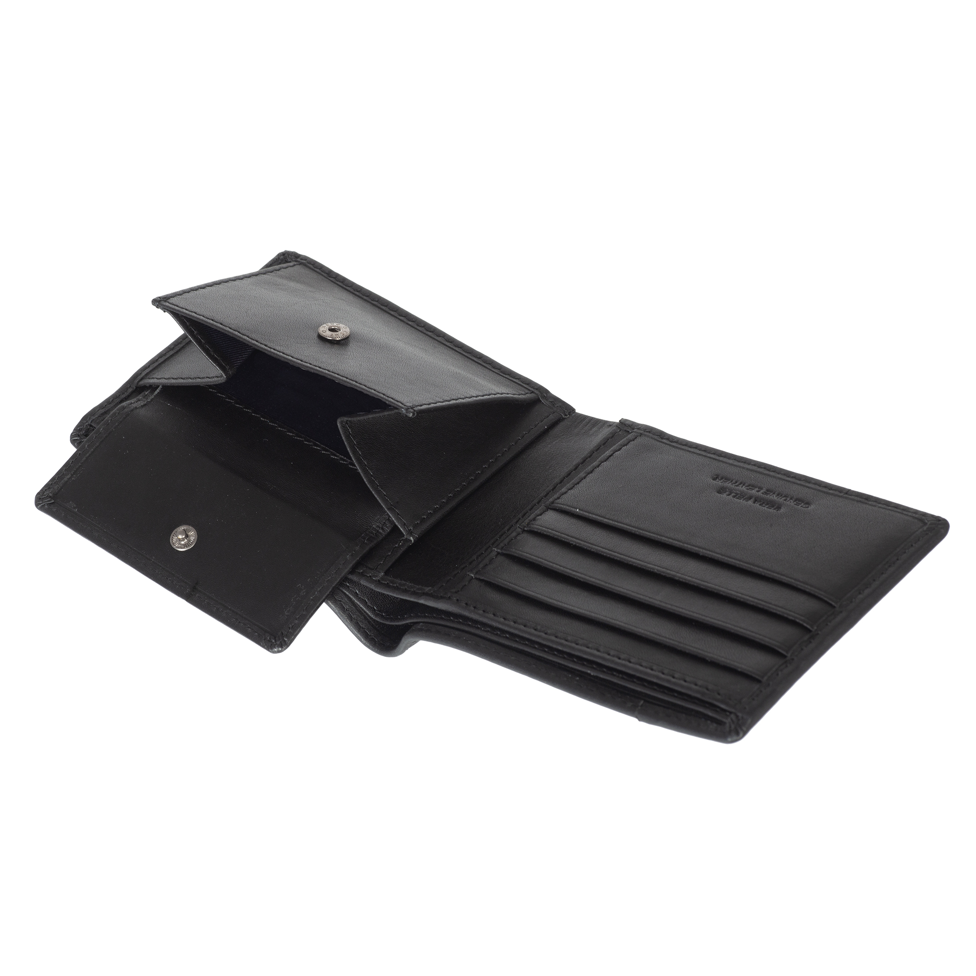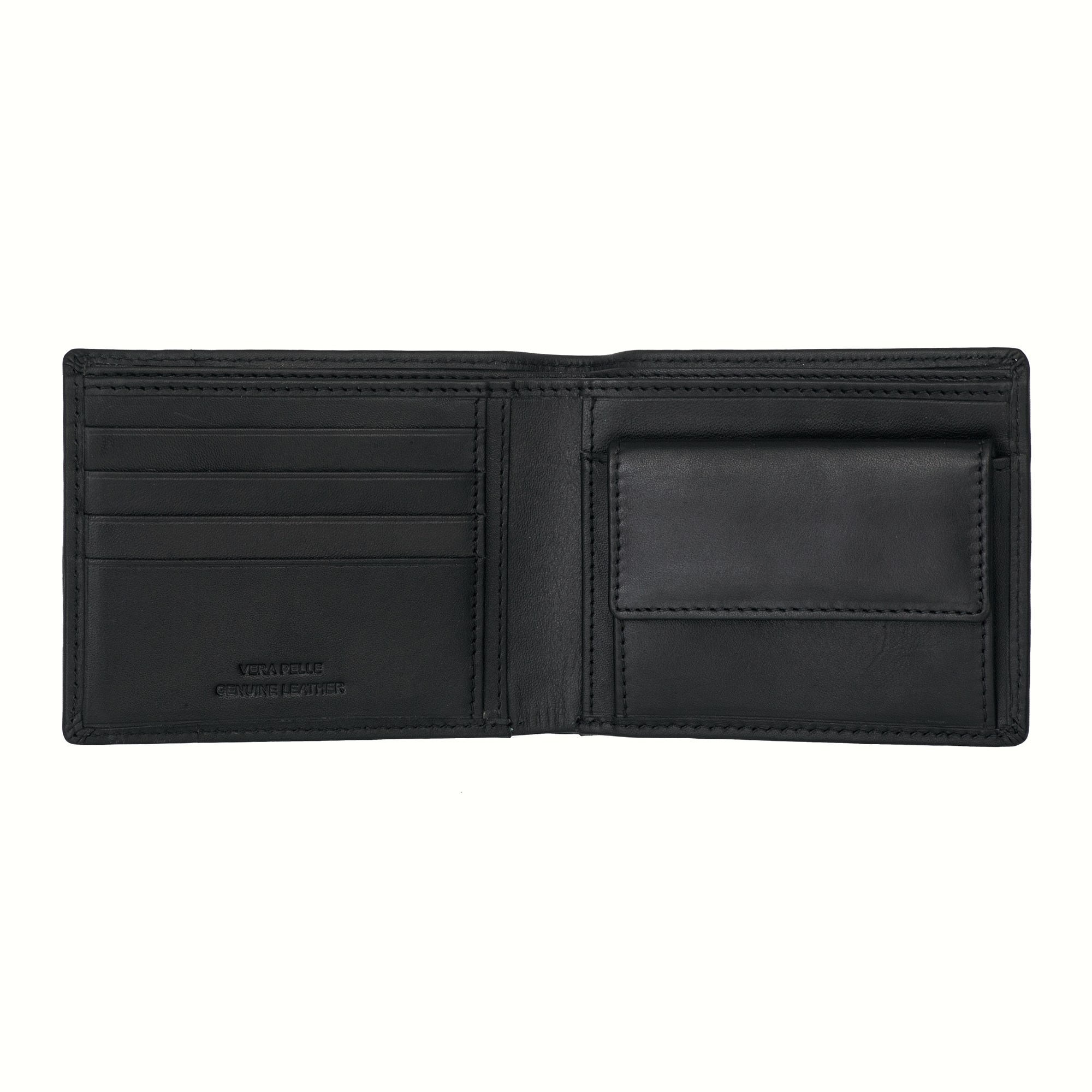 Портмоне раскладывается пополам. Внутри два отдела для купюр, отделение для монет на кнопке, четыре потайных кармана, четыре кармашка для пластиковых карт.