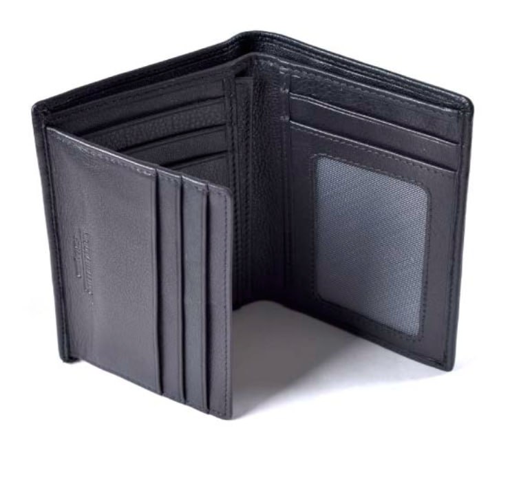 Портмоне раскладывается пополам, внутри одно отделение для купюр, потайной карман, семь кармашков для пластиковых карт, два сетчатых отделений для пропуска, съемный сетчатай вкладыш для пропуска. Оснащено RFID-защитой, что позволяет защитить банковские карты от считывания. Упаковано в подарочную жестяную коробку.
