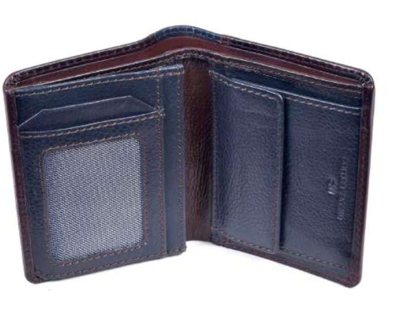 Мужское портмоне из натуральной кожи, раскладывается пополам, внутри два отдела для купюр, два потайных кармана, четыре кармашка для пластиковых карт, два сетчатых кармана, отдел для монет на кнопке. Оснащено RFID-защитой, что позволяет защитить банковские карты от считывания. Упаковано в подарочную жестяную коробку.