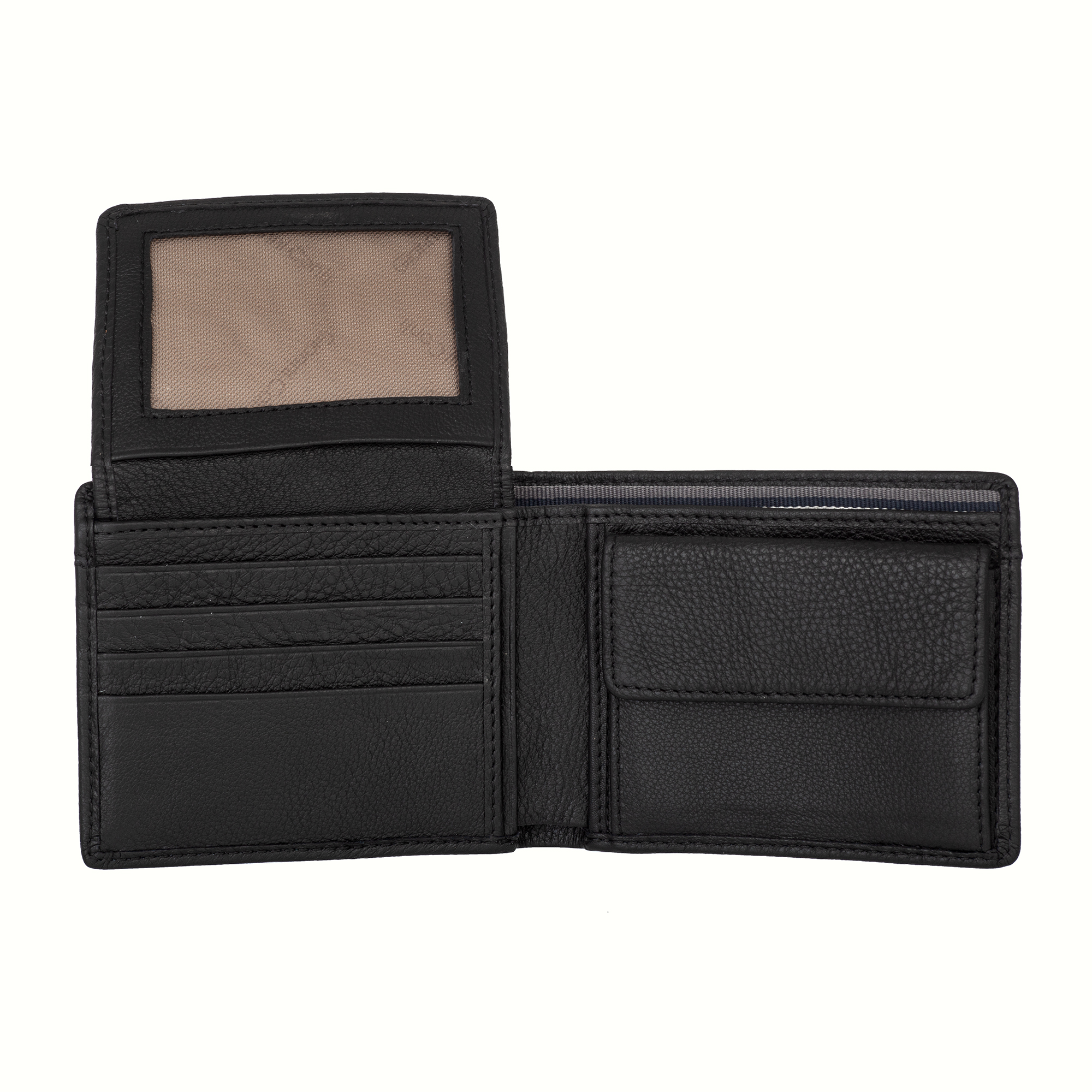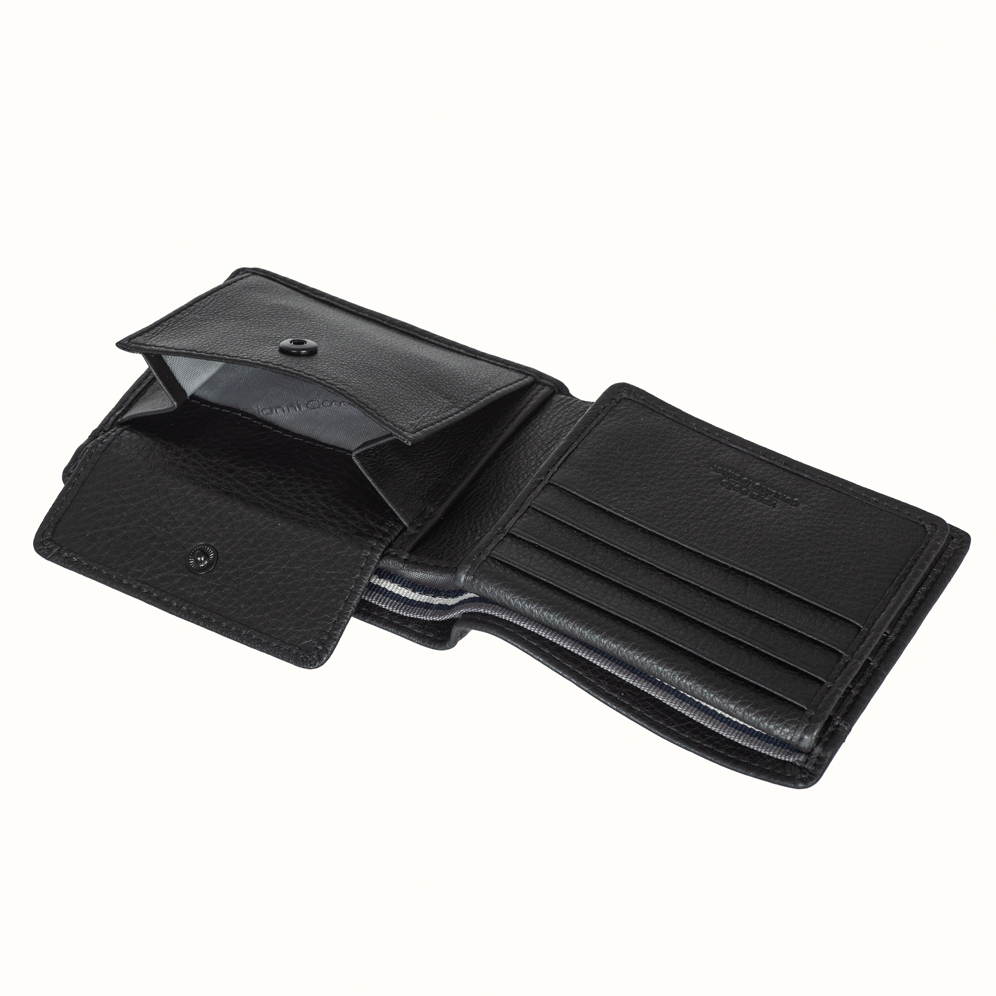 Мужское черное портмоне из натуральной кожи от бренда Gianni Conti. Внутри два отдела для купюр, карман для монет на кнопке, восемь кармашков для пластиковых карт, карман в сеточку и четыре потайных кармана.
