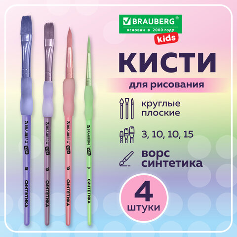 Кисти c силиконовой вставкой НАБОР 4 шт. (синтетика круглые №3, 10; плоские №10, 15), блистер, BRAUBERG KIDS, 201097, 12шт.#S