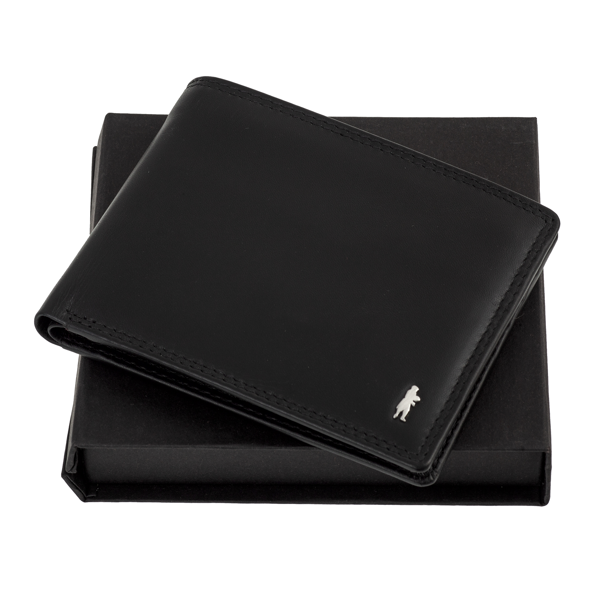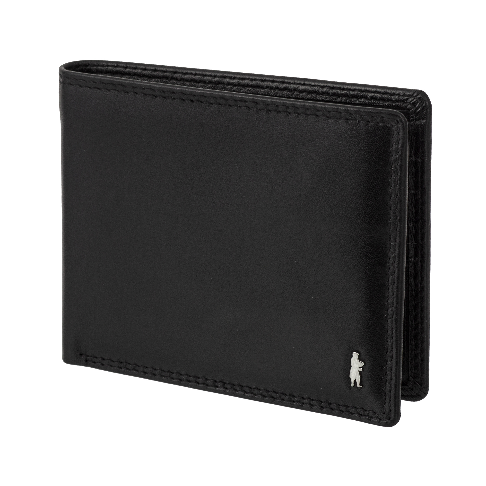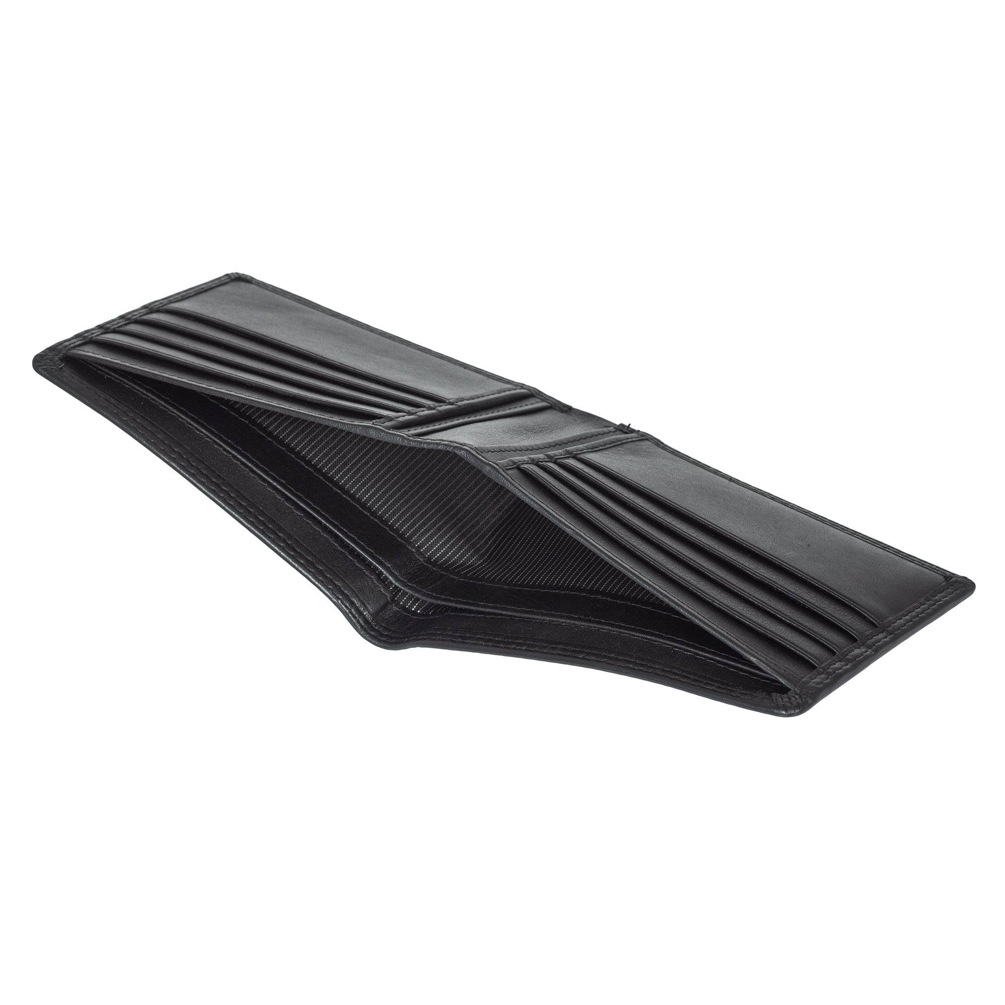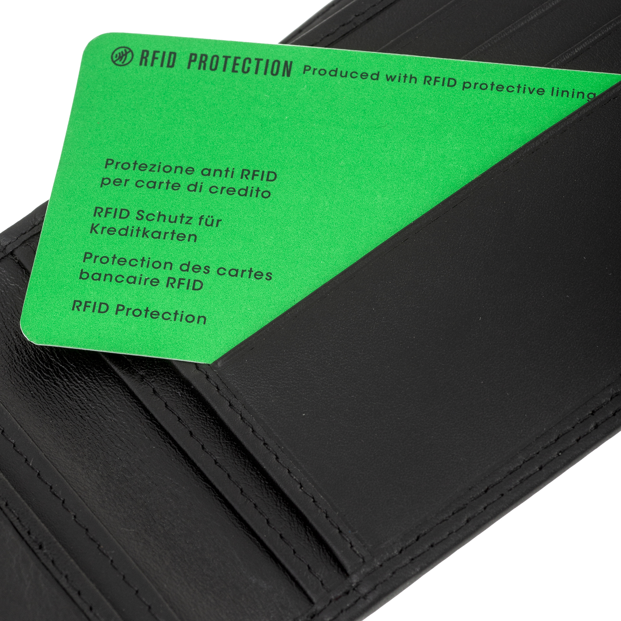 Портмоне раскладывается пополам, внутри два отдела для купюр, восемь кармашков для пластиковых карт, четыре отдела для документов. Имеет защитный слой от считывания кары RFID-Protection.