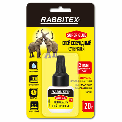 Клей секундный "HQ" суперклей УЛЬТРАПРОЧНЫЙ, 2 иглы для точечных работ, 20 г, RABBITEX (РАББИТЕКС) "ДВА СЛОНА", 609808, 12шт.#S